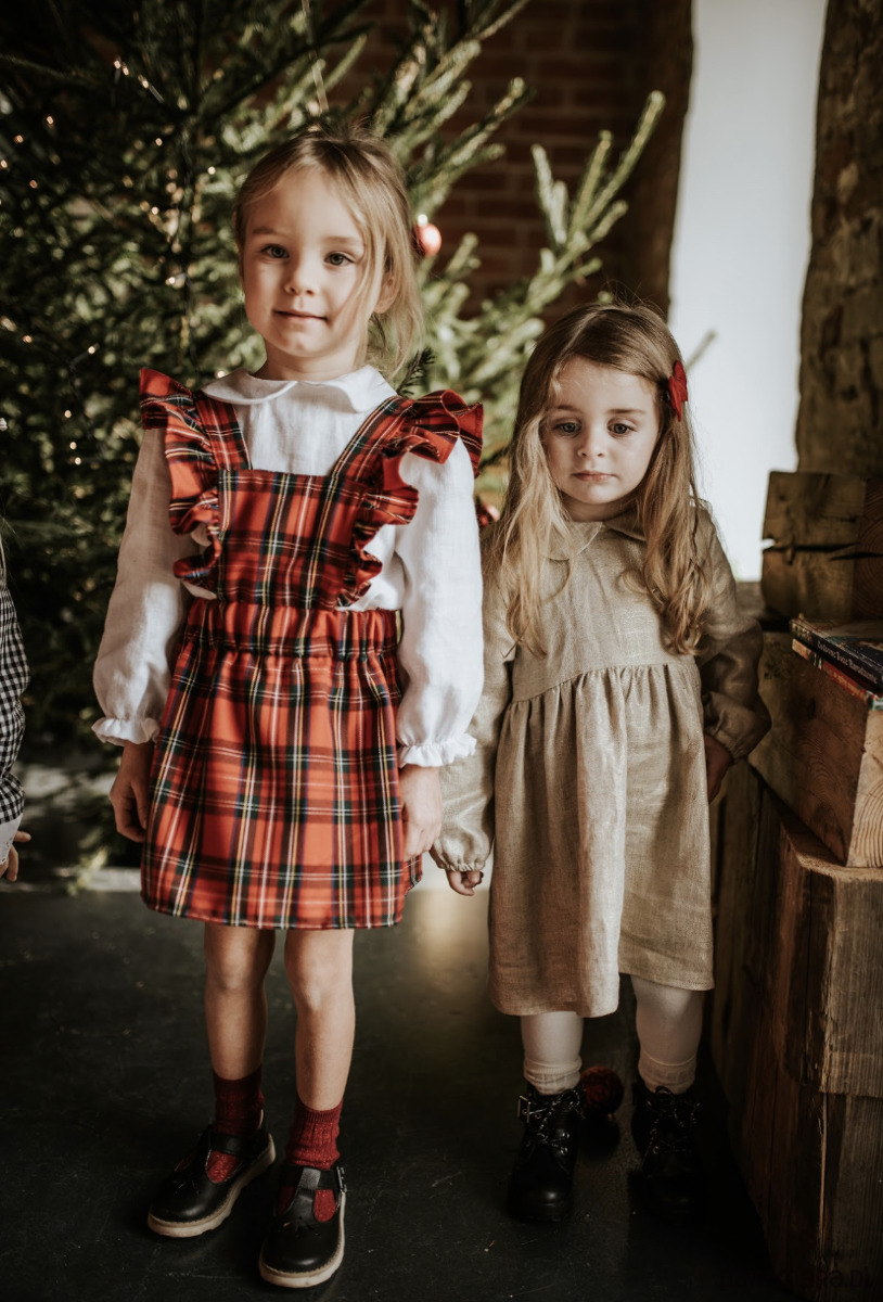 Urocza spódniczka- ogrodniczka z falbankami na szelkach to nasza kolejna świąteczna propozycja stanowiąca alternatywę dla tradycyjnych sukienek.
