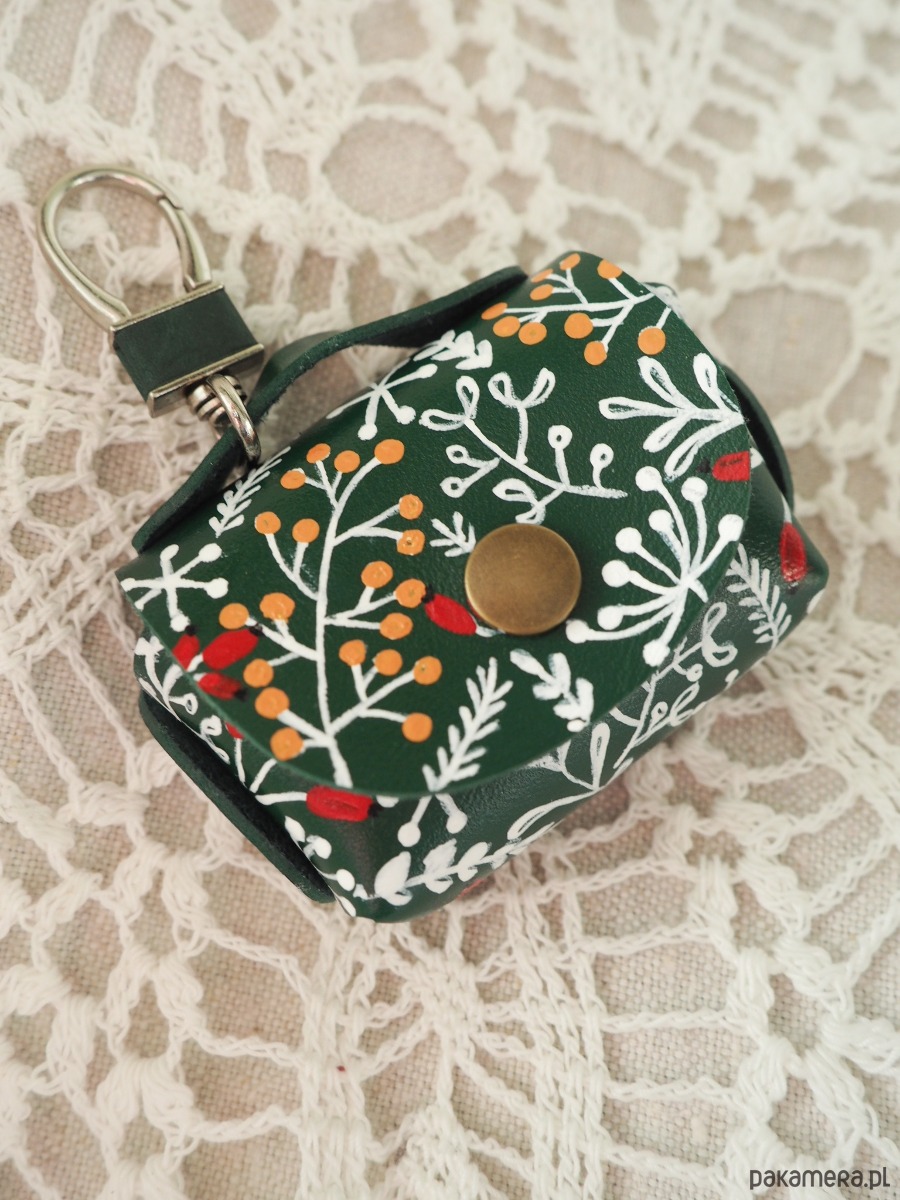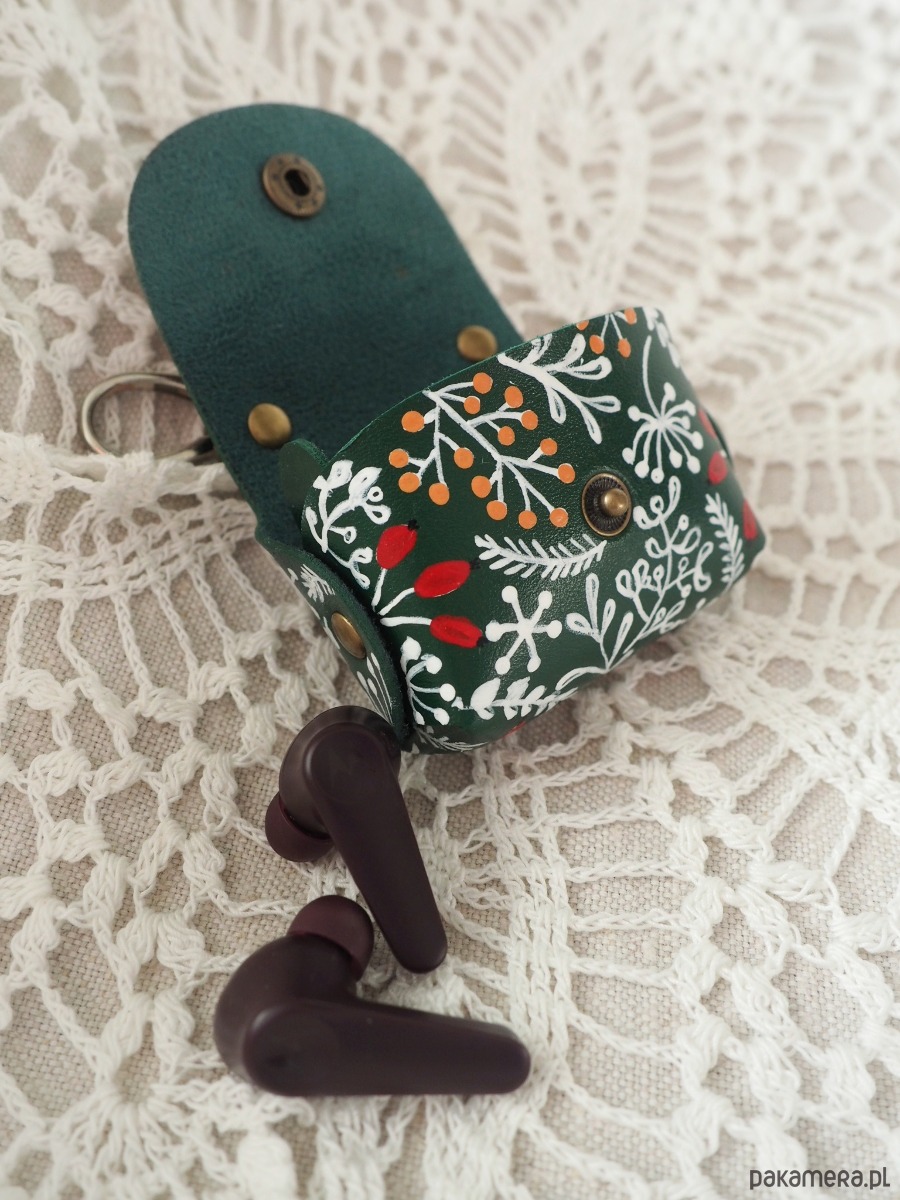 Uniwersalne lekkie etui na słuchawki w świąteczny wzór, wykonane ze sztucznej ciemnozielonej skóry. Posiada zapięcie pozwalające na przyczepienie do torebki, smyczy, czy szlufki spodni, dzięki czemu zawsze możesz mieć swoje słuchawki na wierzchu, pod ręką, jak breloczek. Świetnie spełni też rolę małej portmonetki.