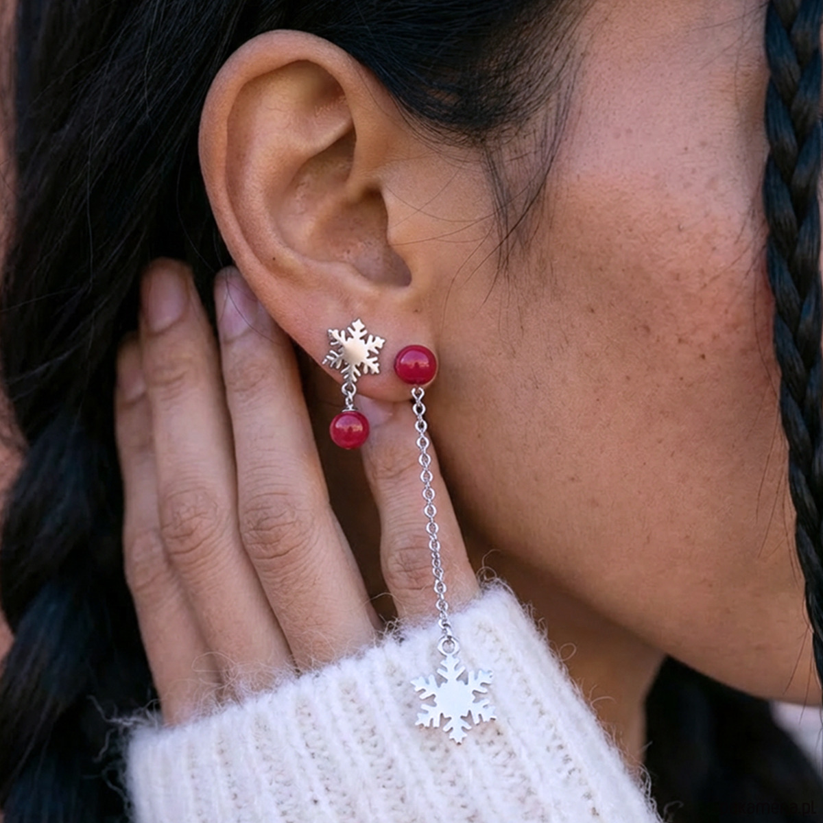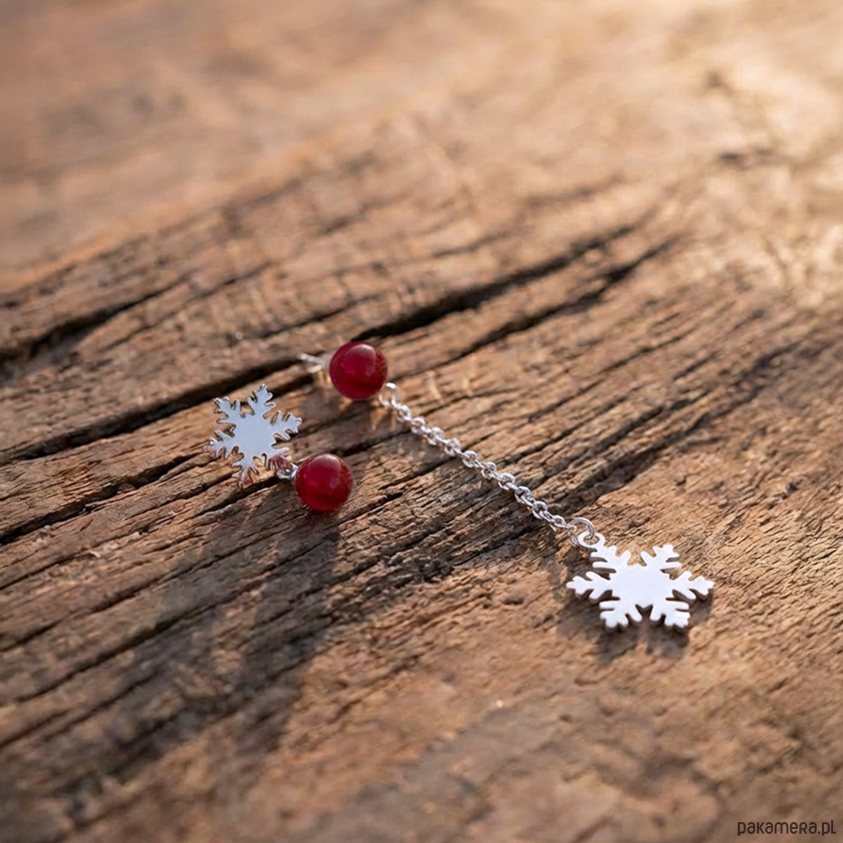 Delikatne, słodkie i kobiece kolczyki wkręty inspirowane zimowym motywem jarzębiny. Asymetryczna forma – połączenie gwiazdki i subtelnej jarzębinki zawieszonej na cienkim łańcuszku – nadaje biżuterii lekkości i świątecznego uroku.