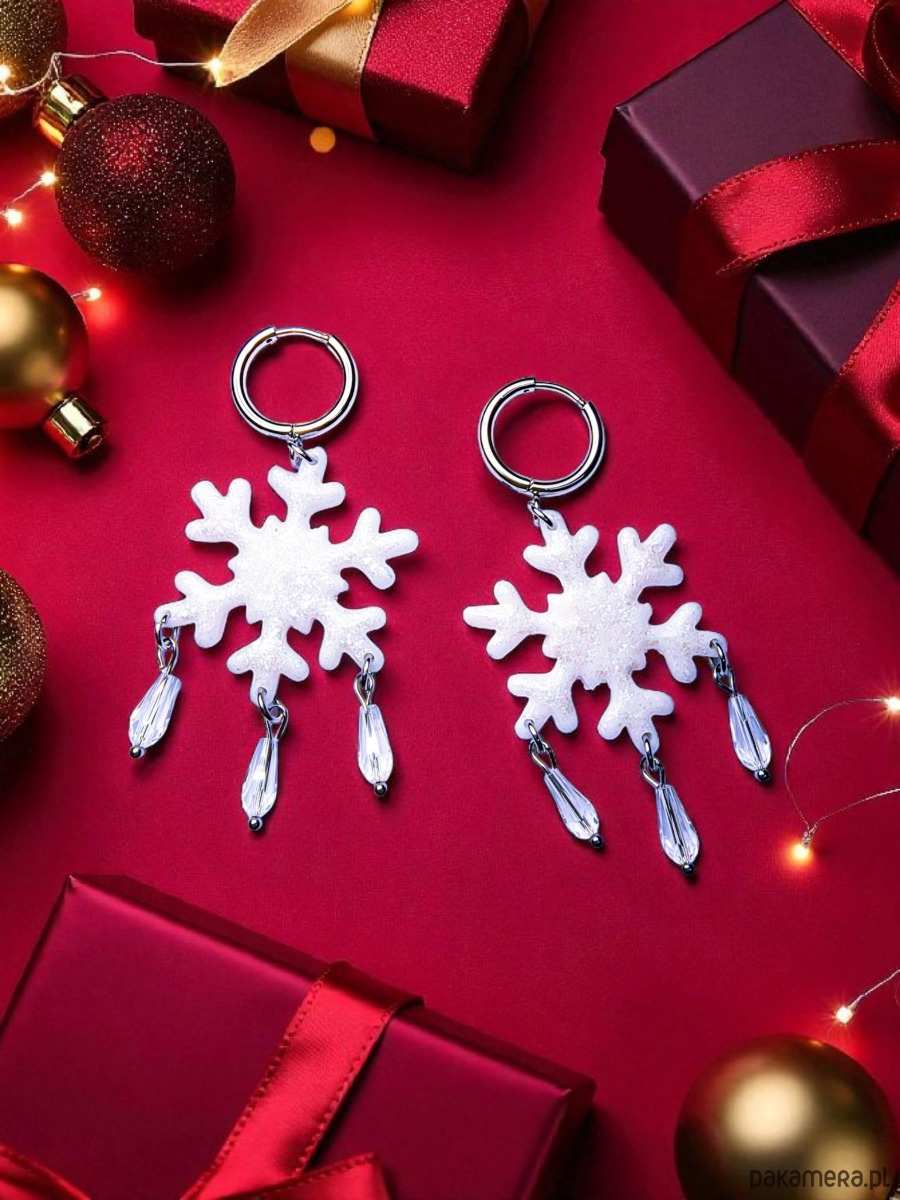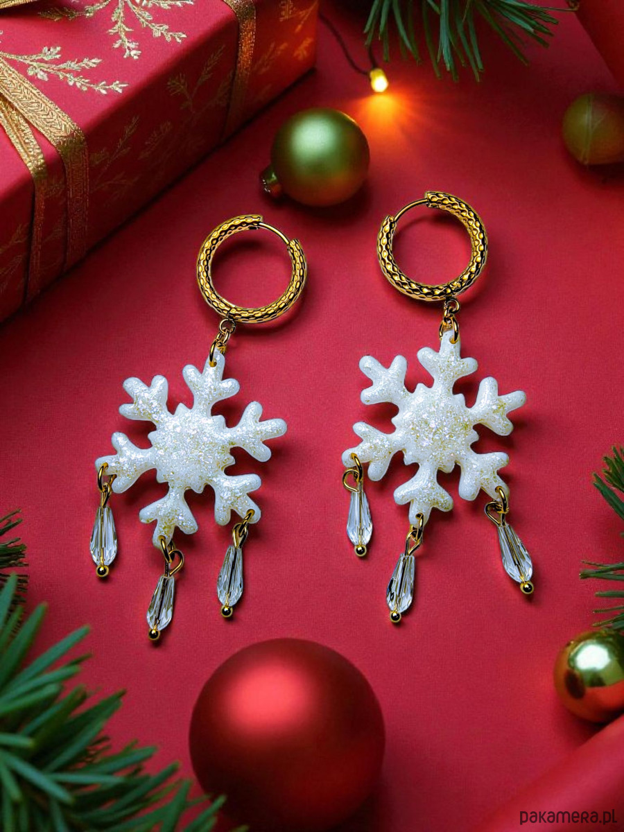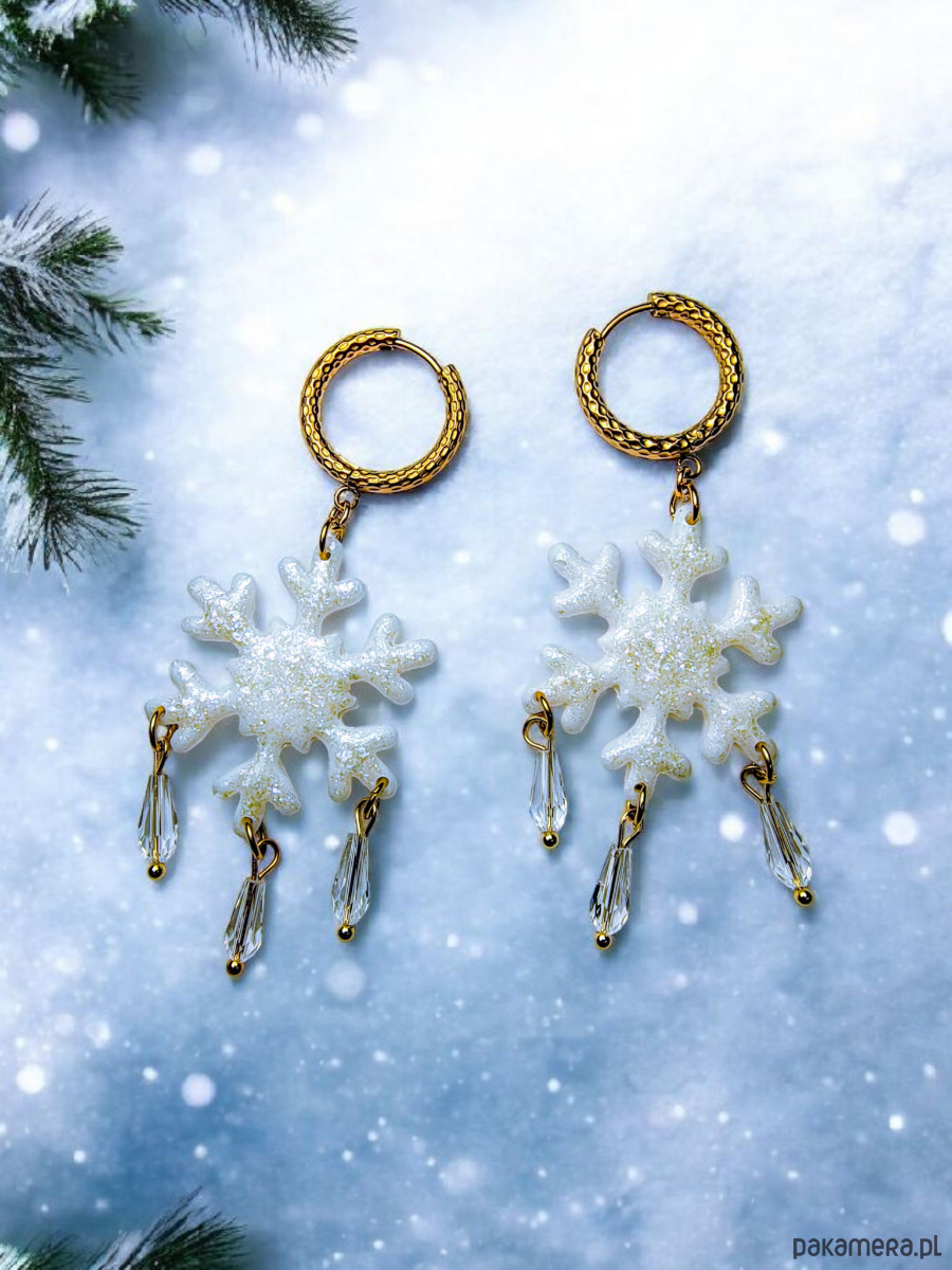 Te wyjątkowe kolczyki w kształcie śnieżynek zostały wykonane ręcznie z glinki polimerowej i pokryte subtelnym brokatem, który pięknie odbija światło, tworząc efekt delikatnego migotania niczym prawdziwy śnieg w słońcu.