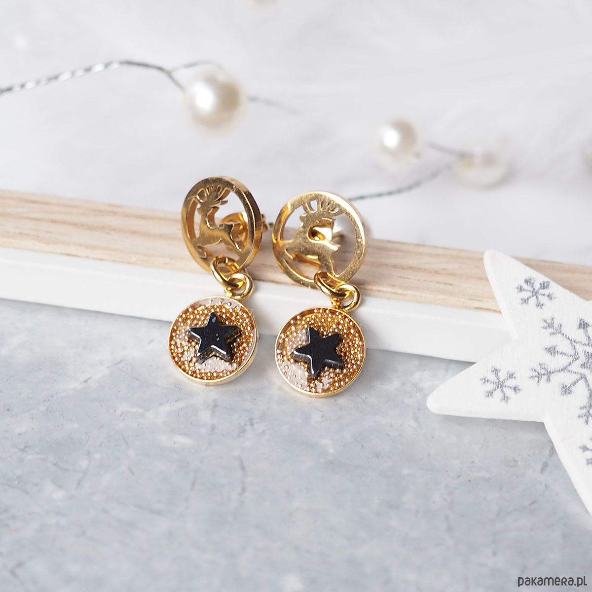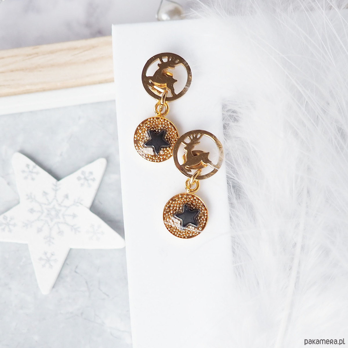 ŚWIĄTECZNE KOLCZYKI z reniferami i gwiazdkami, srebro pozłacane