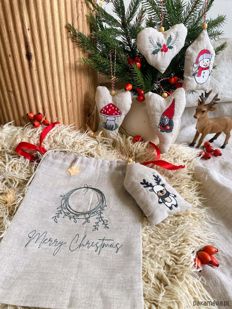 Zestaw pięciu lnianych zawieszek został wykonany z dbałością o każdy detal — ręcznie szyte, ozdobione maszynowym haftem i delikatnie wypełnione miękkim wkładem oraz kilkoma aromatycznymi goździkami, które dodają im subtelnego, zimowego zapachu.