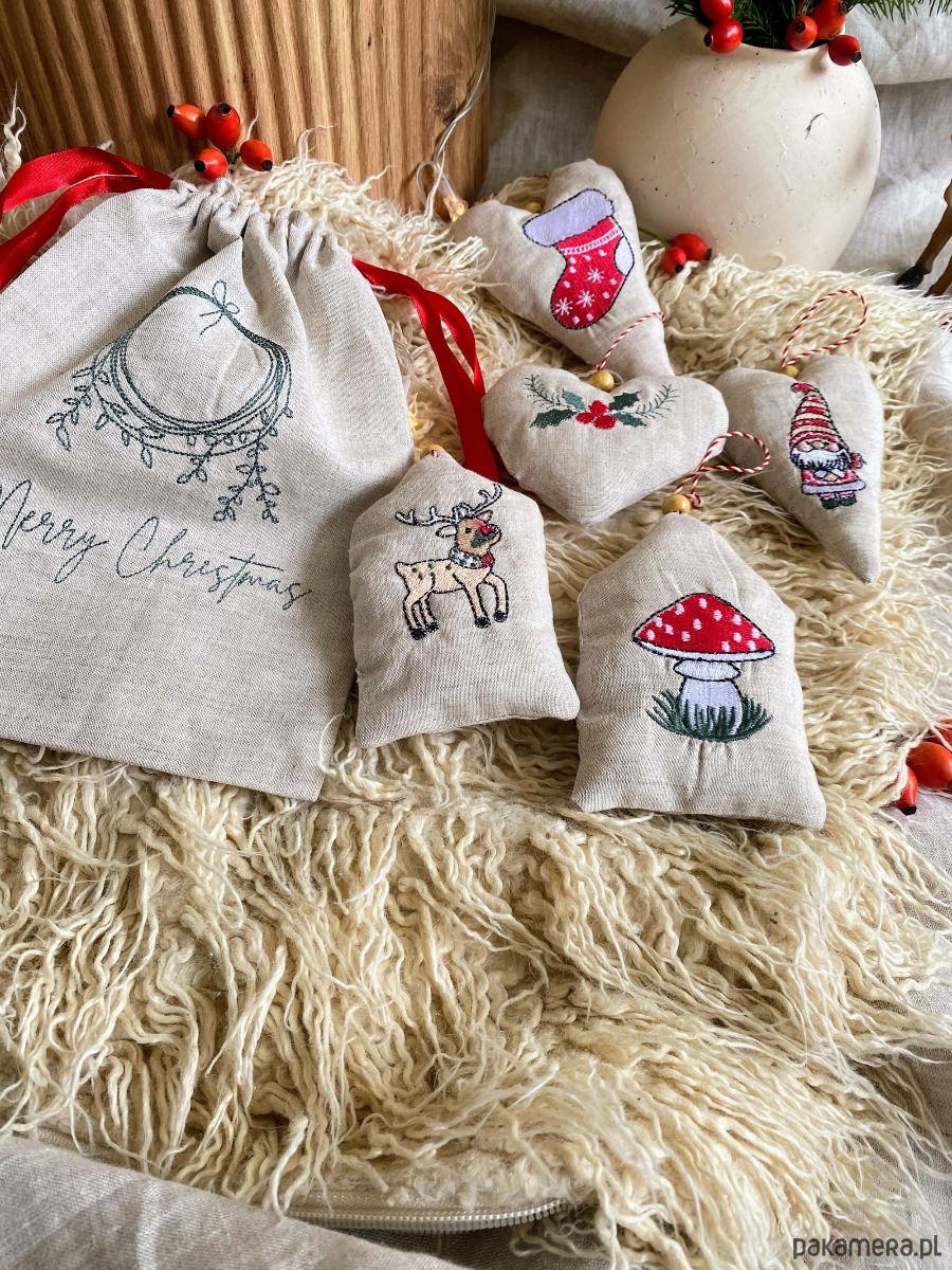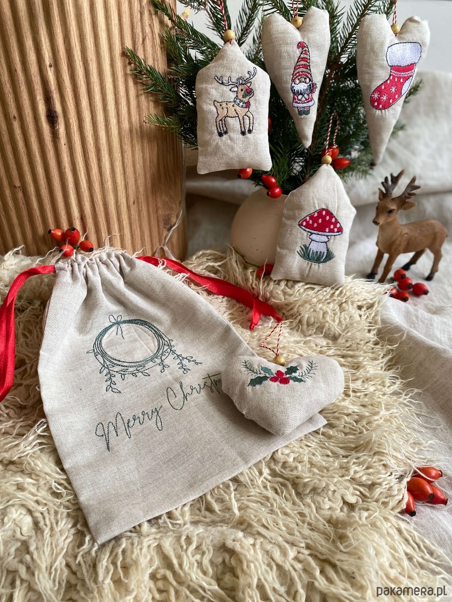Cały zestaw zapakowany jest w lniany woreczek z haftem świątecznym, przewiązany czerwonymi wstążkami — gotowy do wręczenia jako prezent lub przechowania dekoracji.