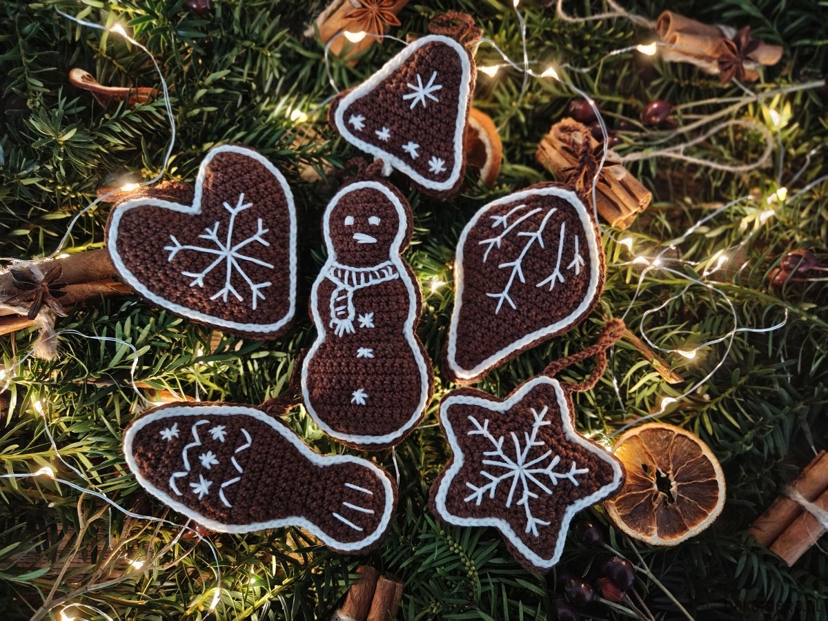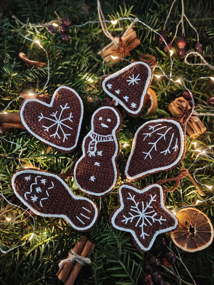 Sześć szydełkowych zawieszek w kształcie pierniczków to niepowtarzalna dekoracja każdej choinki.