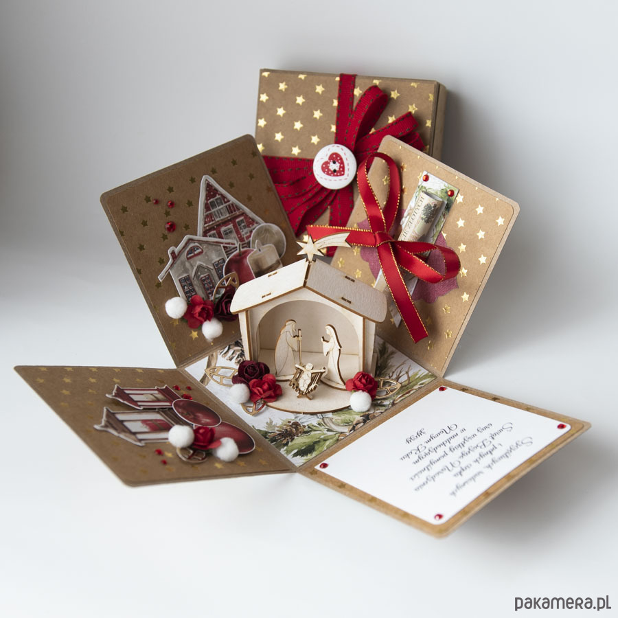 Na środku pudełka znajduje się miniaturowa szopka, na ściankach motywy świąteczne, życzenia bożonarodzeniowe i miejsce na pieniądze.