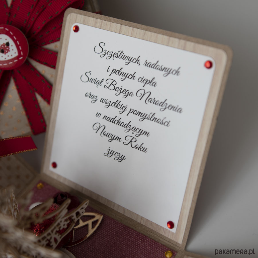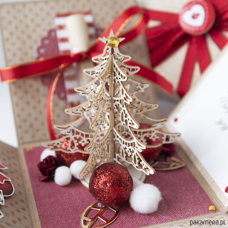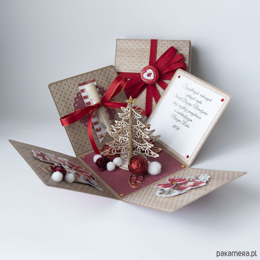 Na środku pudełka znajduje się miniaturowa choinka, na ściankach motywy świąteczne, życzenia bożonarodzeniowe i miejsce na pieniądze.