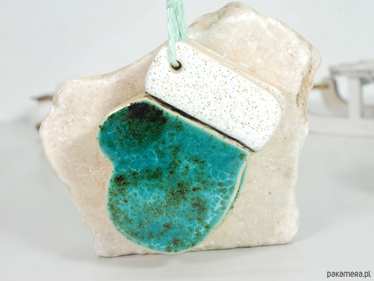 Ręcznie wykonane ceramiczne zawieszki w kształcie zimowych rękawiczek to wyjątkowa, turkusowa dekoracja, która doda choince świeżości i zimowego klimatu. Każda ozdoba została szkliwiona unikatowym połączeniem turkusu, zieleni i bieli z delikatnym złocistym nakrapianiem. Idealne jako subtelny akcent do świątecznych aranżacji, dekoracji okna lub prezentu dla świąteczny dla twoich najbliższych.