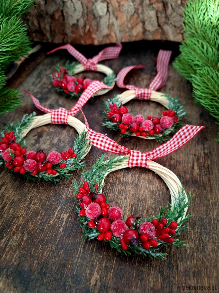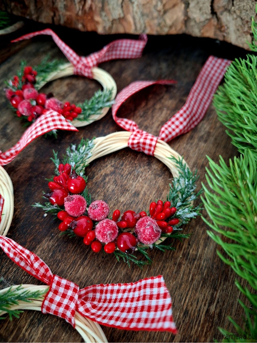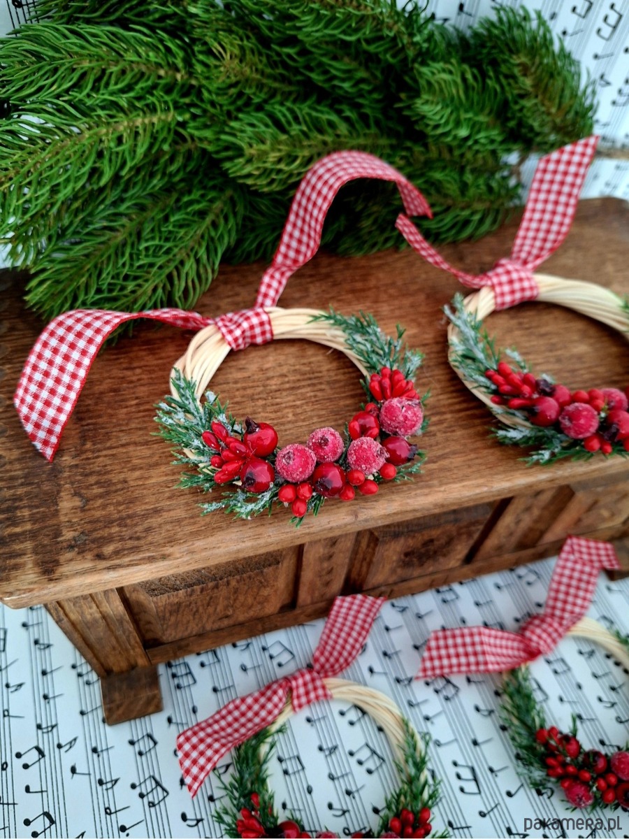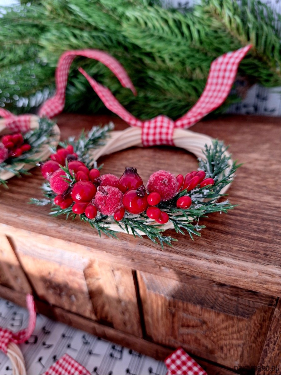 Wianki zostały wykonane ręcznie na wiklinowej podstawie. Ozdobione wstążką, czerwonymi jabłuszkami, sztucznymi gałązkami świerkowymi oraz owocami jagody, ożywią każdą aranżację. Znakomicie wyglądają w pojedynczym egzemplarzu, jak również w całej kompozycji kilku sztuk.