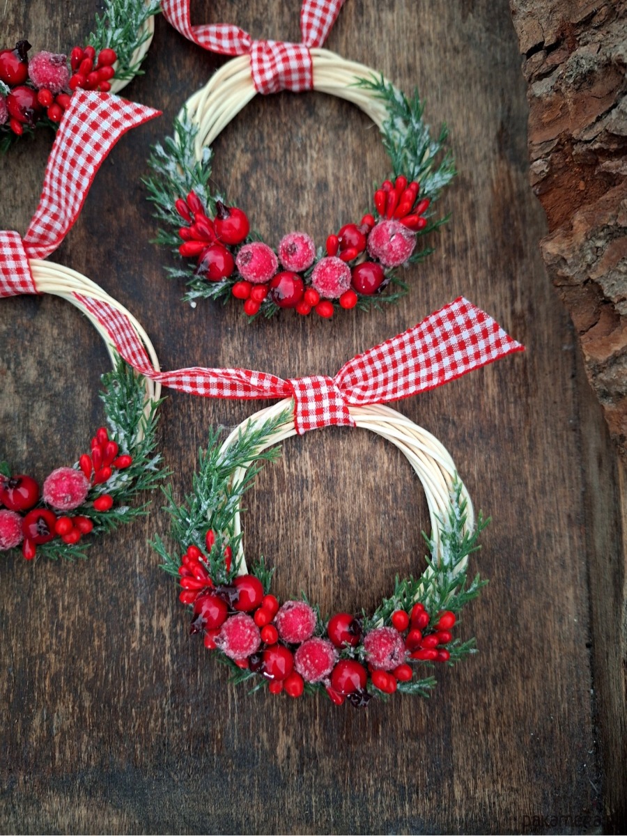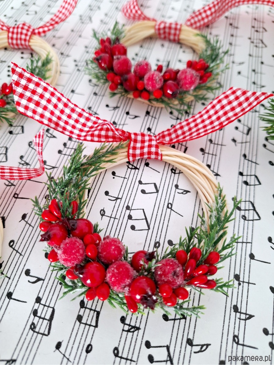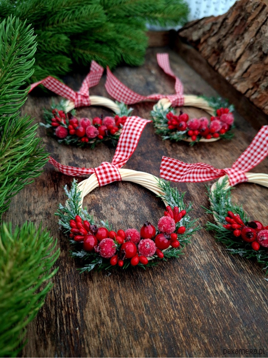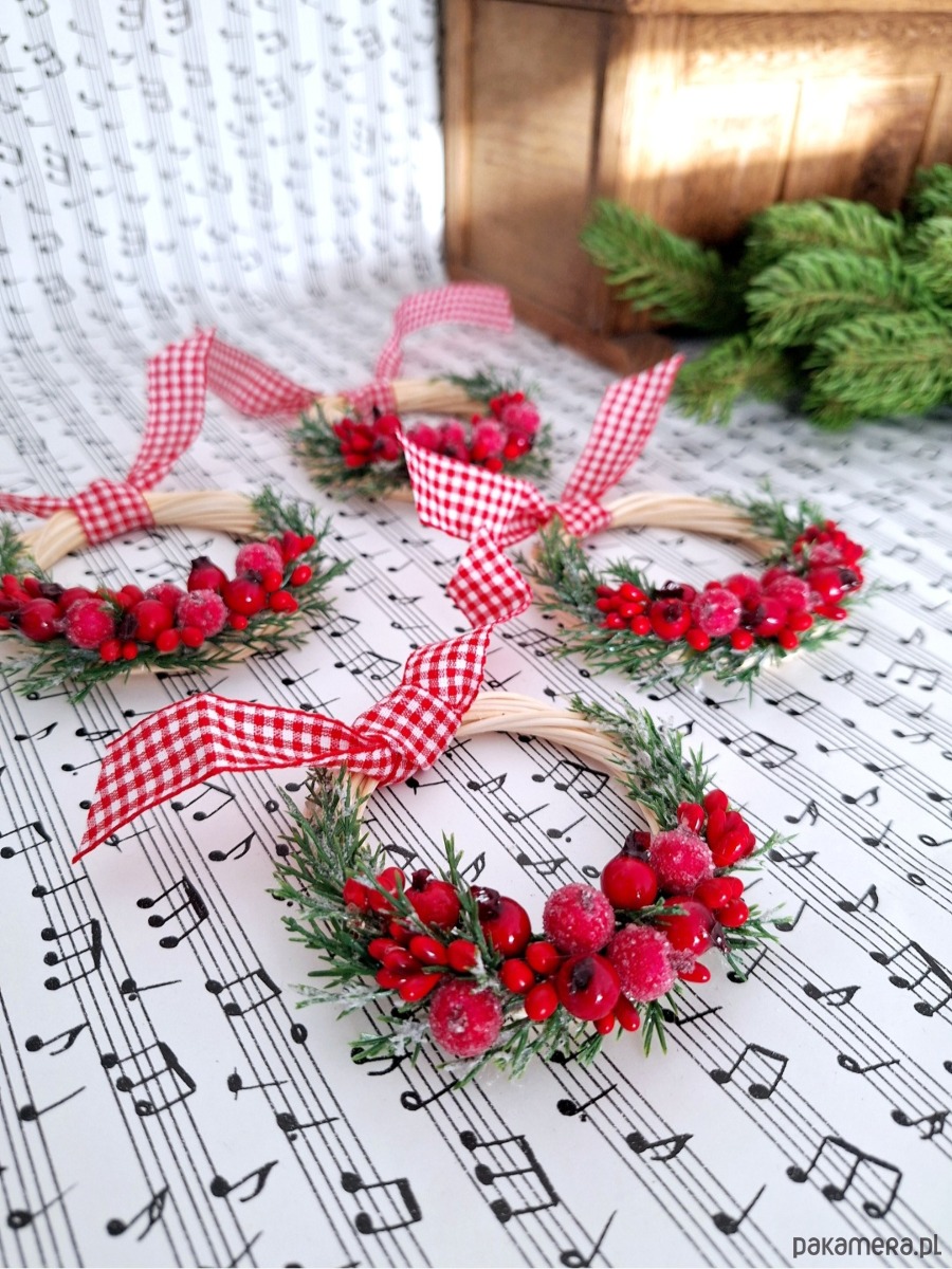 Wianki zostały wykonane ręcznie na wiklinowej podstawie. Ozdobione wstążką, czerwonymi jabłuszkami, sztucznymi gałązkami świerkowymi oraz owocami jagody, ożywią każdą aranżację. Znakomicie wyglądają w pojedynczym egzemplarzu, jak również w całej kompozycji kilku sztuk.