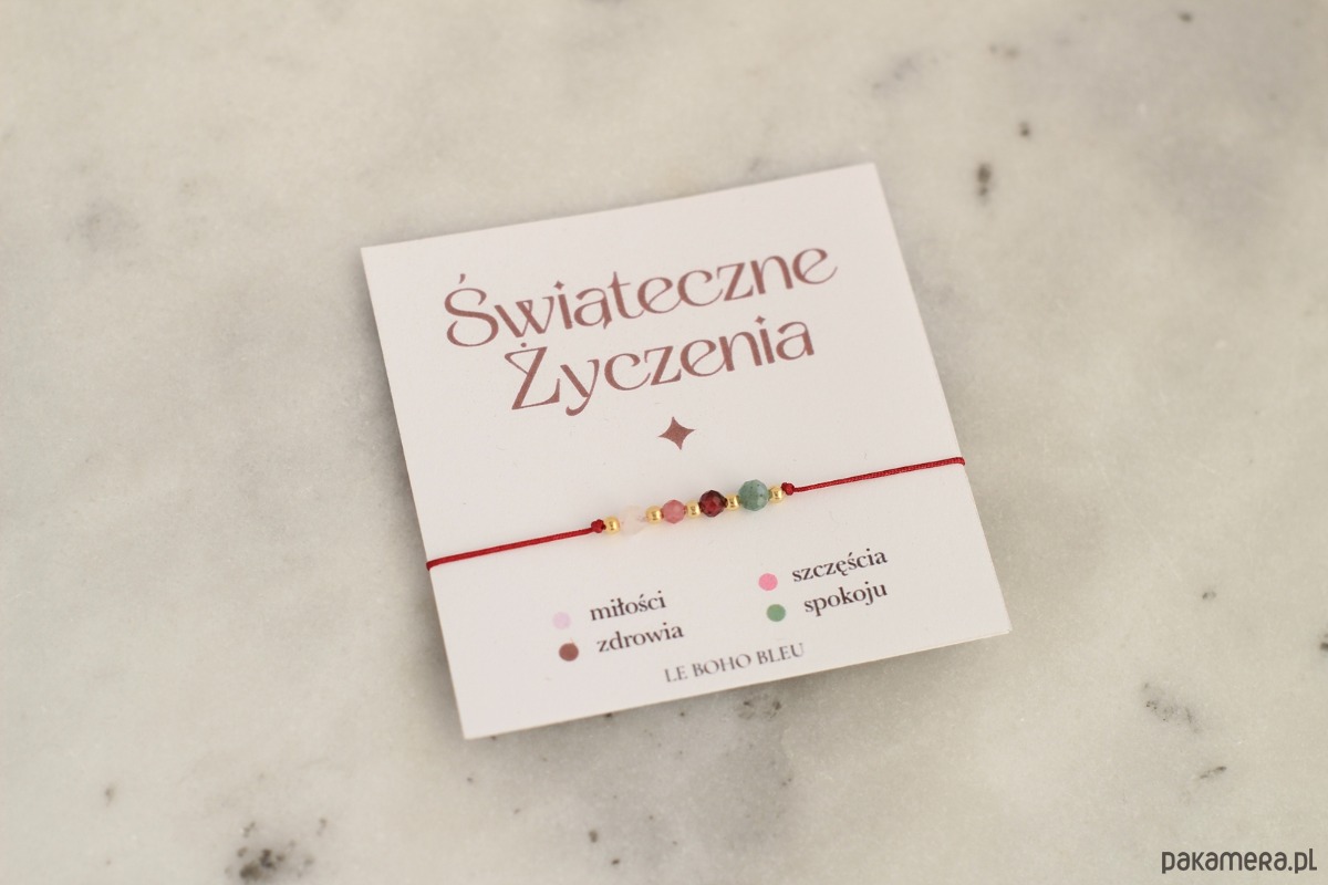 Każda bransoletka przytwierdzona jest do ozdobnego kartonika z życzeniami.
