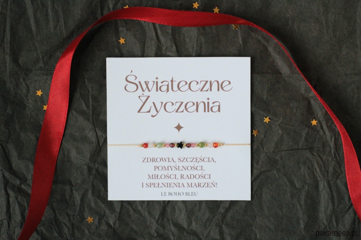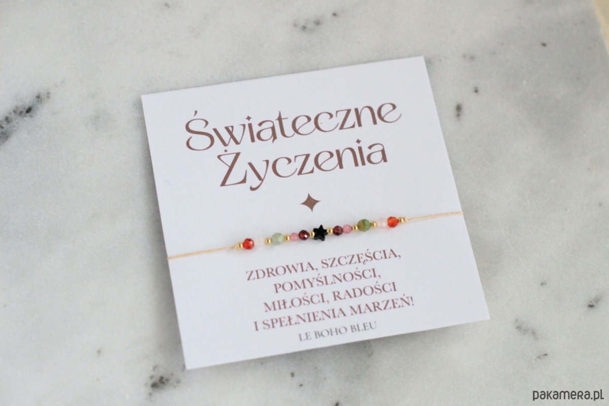Każda bransoletka przytwierdzona jest do ozdobnego kartonika z życzeniami.