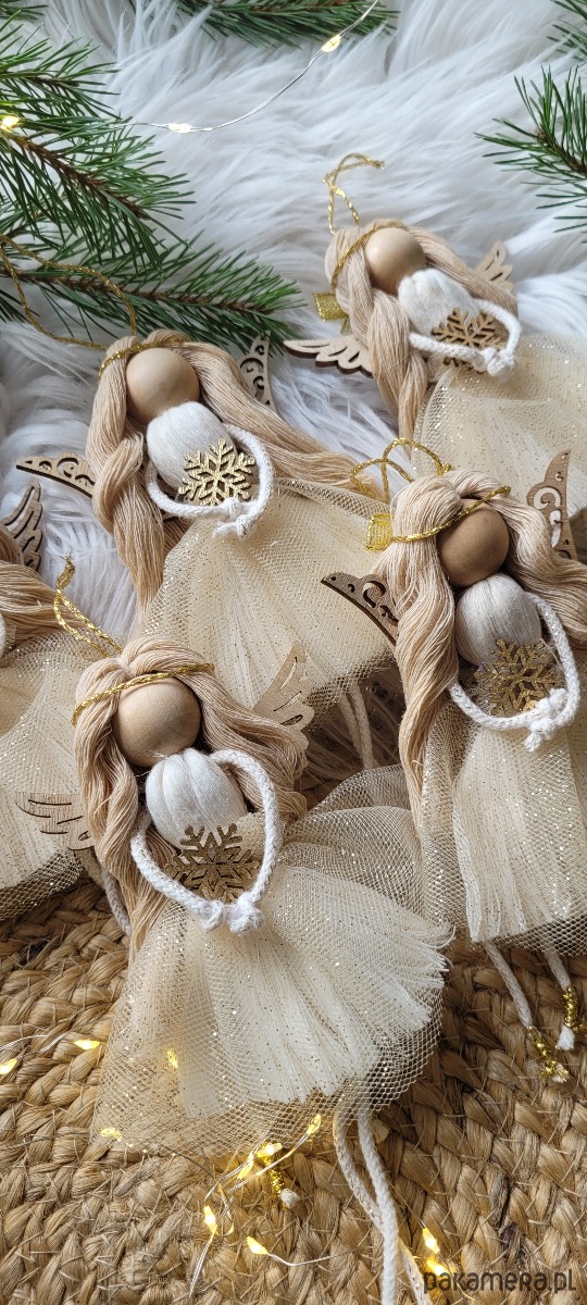 Makramowe aniołki świąteczne – złote, 5 sztuk.