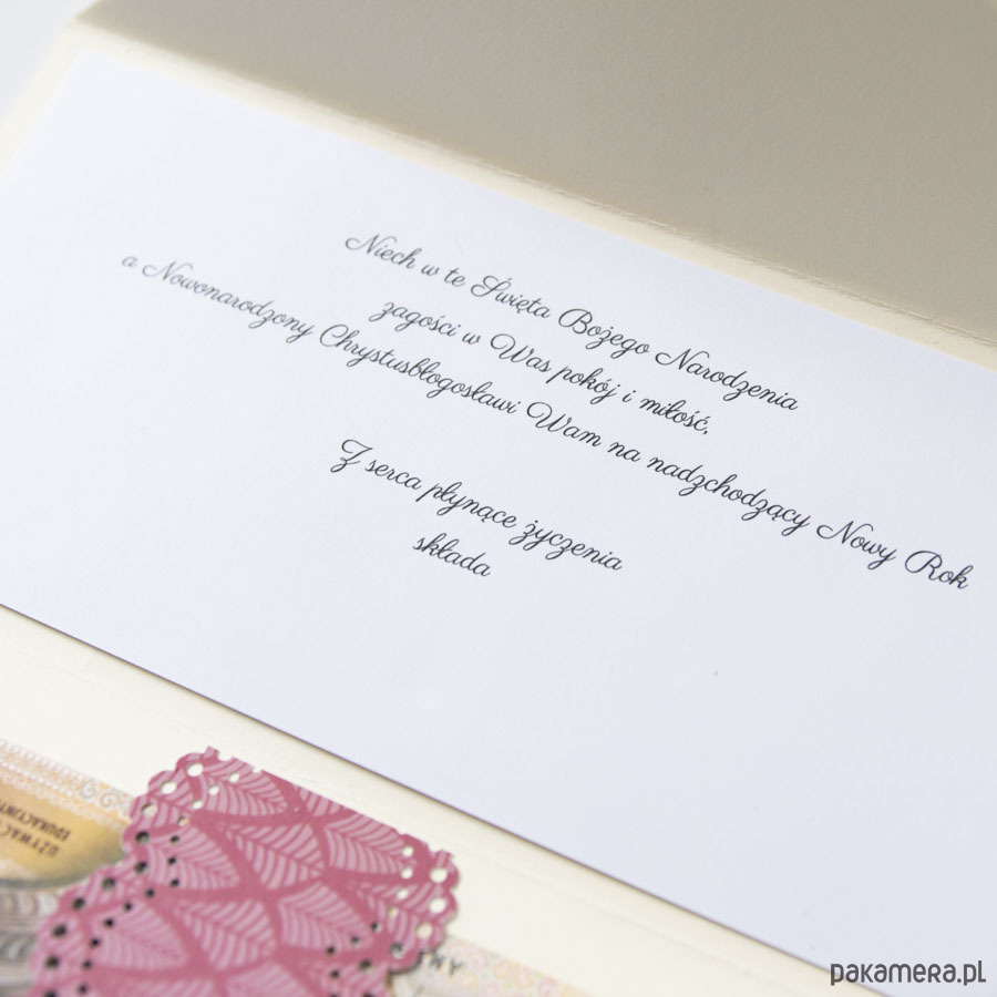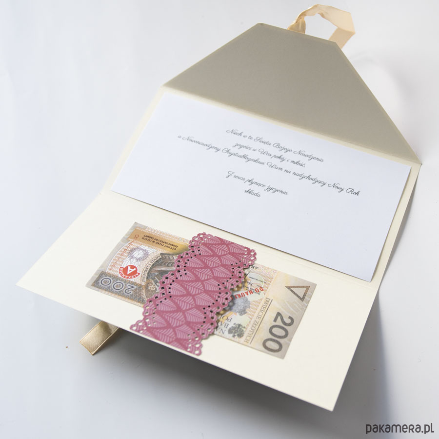 Kartka ma formę rozkładanego folderu, w środku znajduje się miejsce na życzenia oraz miejsce na pieniądze (kieszonka z wzorzystego papieru na jednym ze skrzydełek kartki).