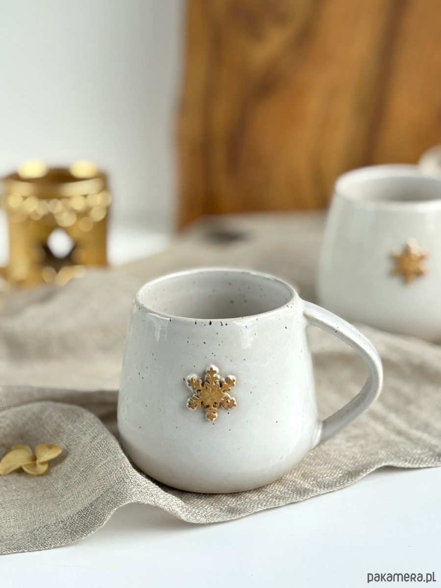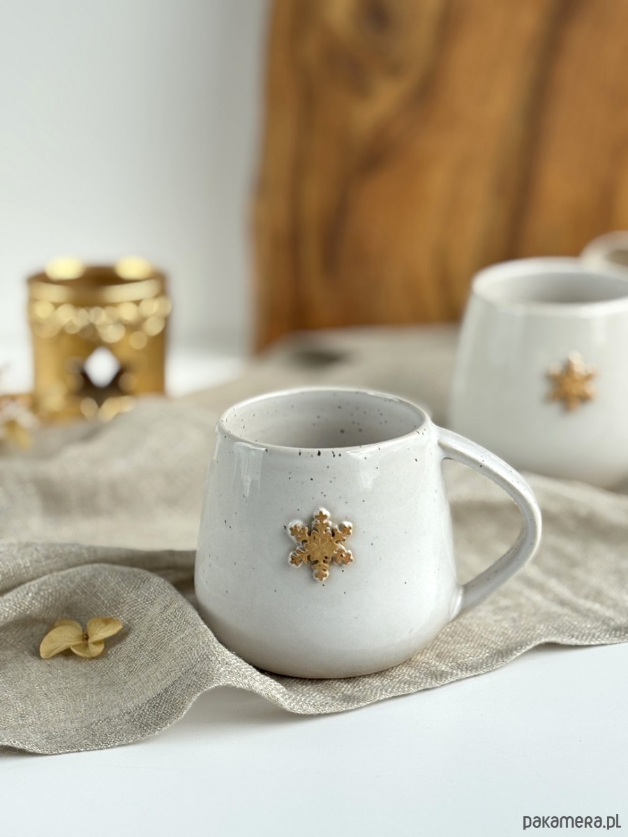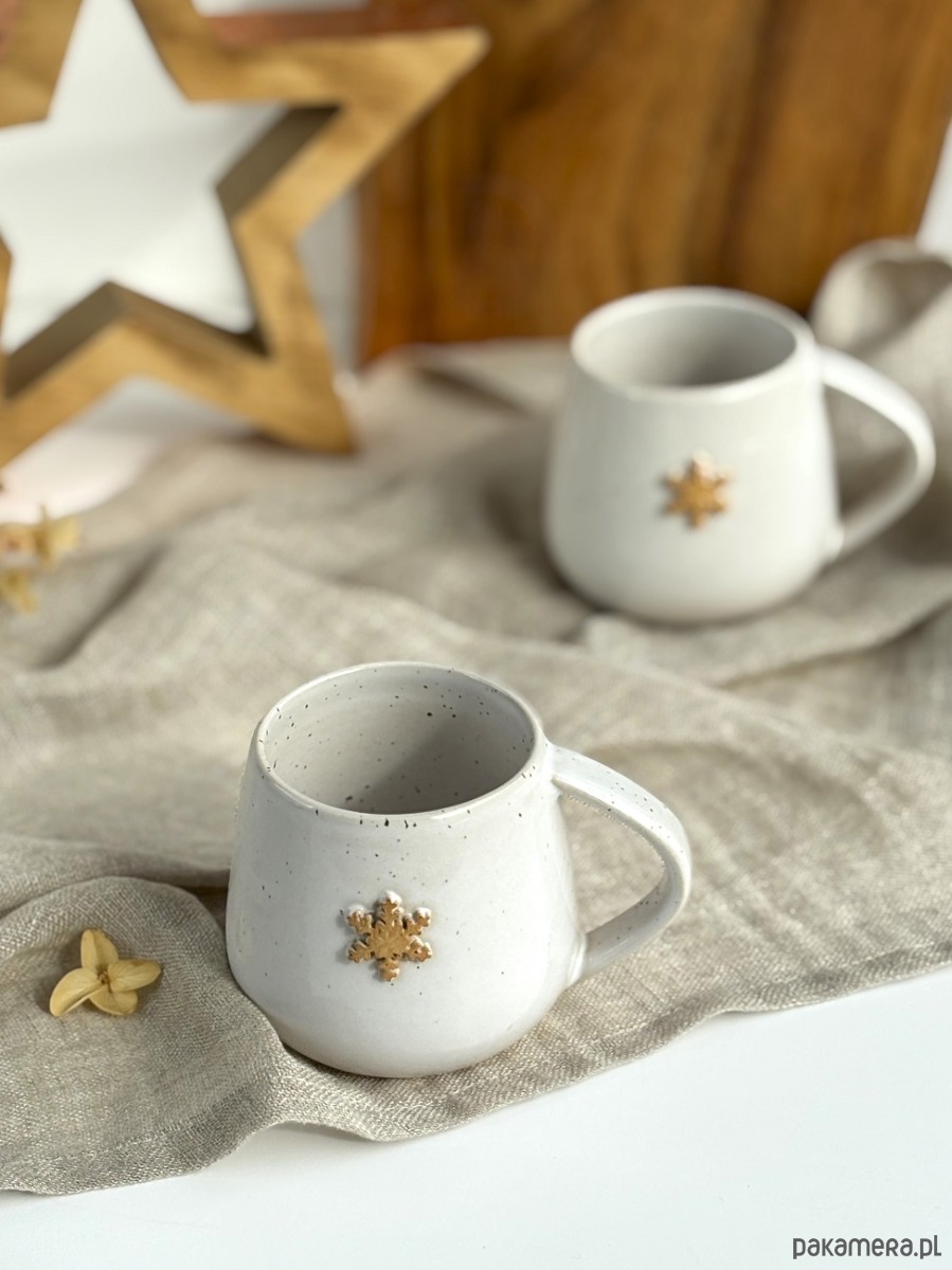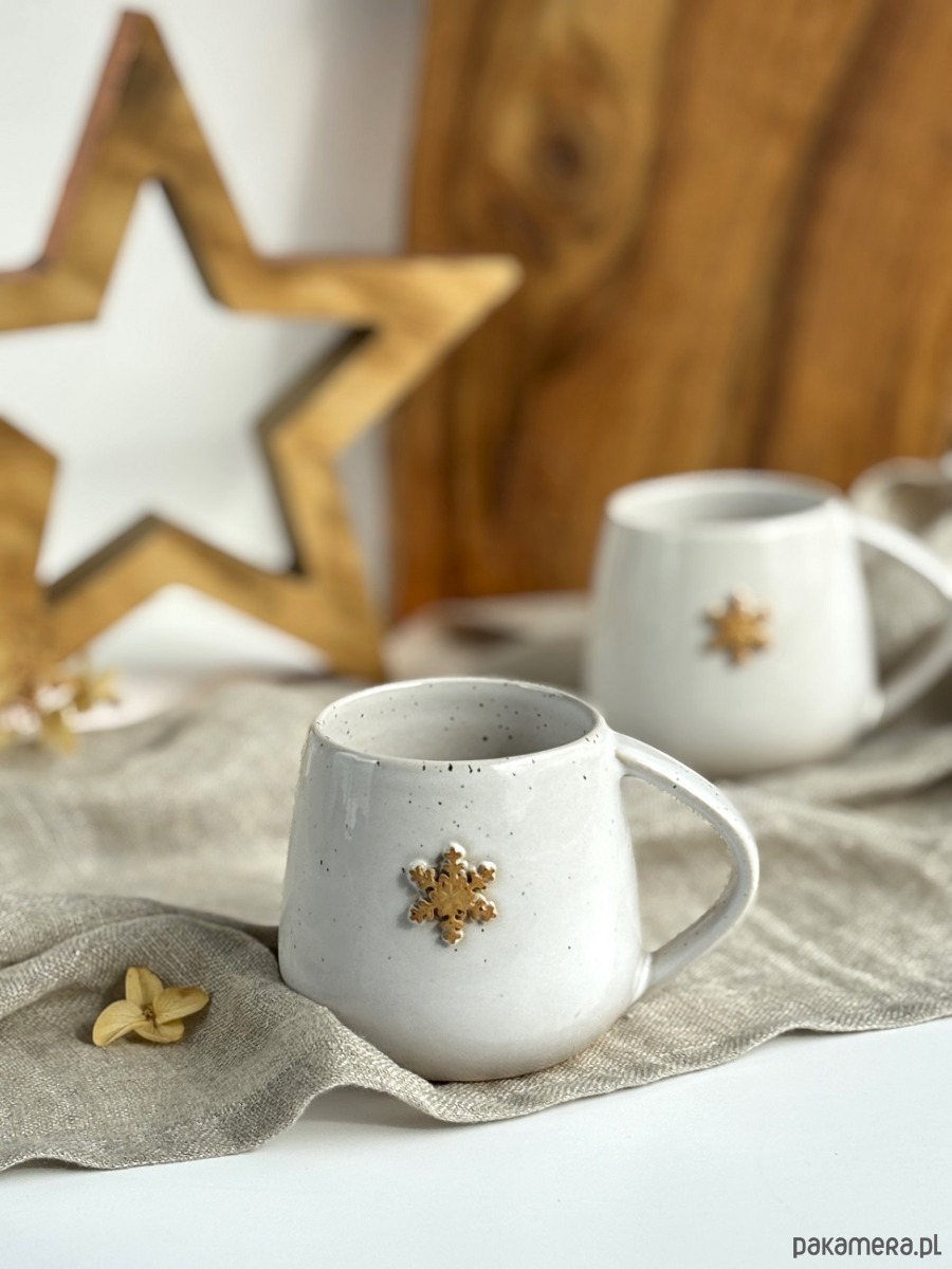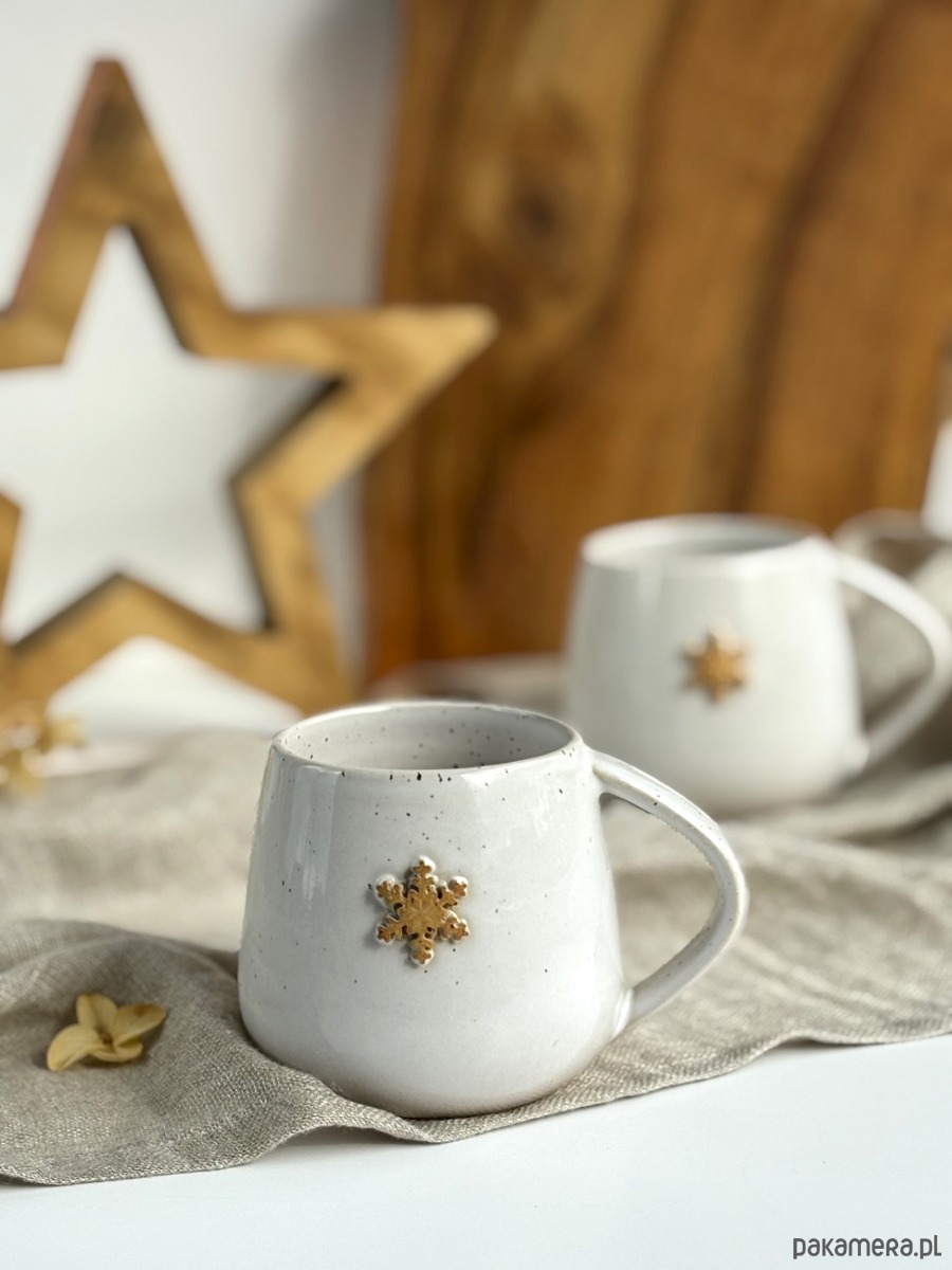 Świąteczny Kubek Beczułka ręcznie robiony 320 ml - Biały ze śnieżynką