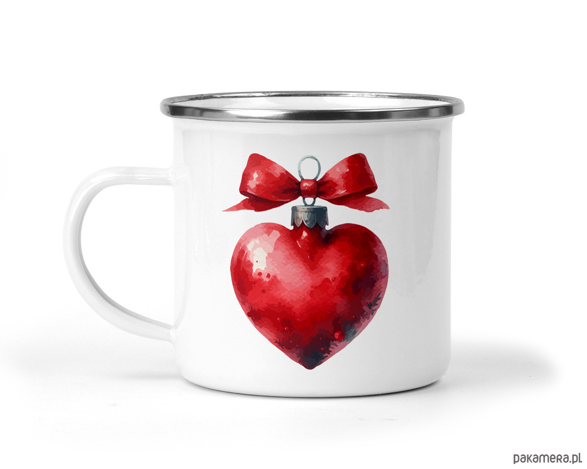 Emaliowany kubek wraz z grafiką widoczną na zdjęciach.