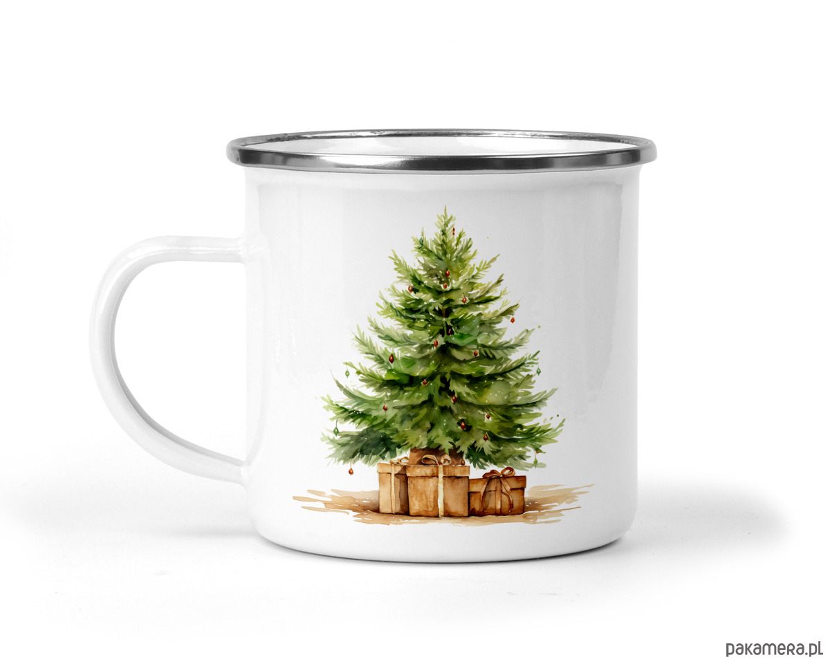 Emaliowany kubek wraz z grafiką widoczną na zdjęciach.