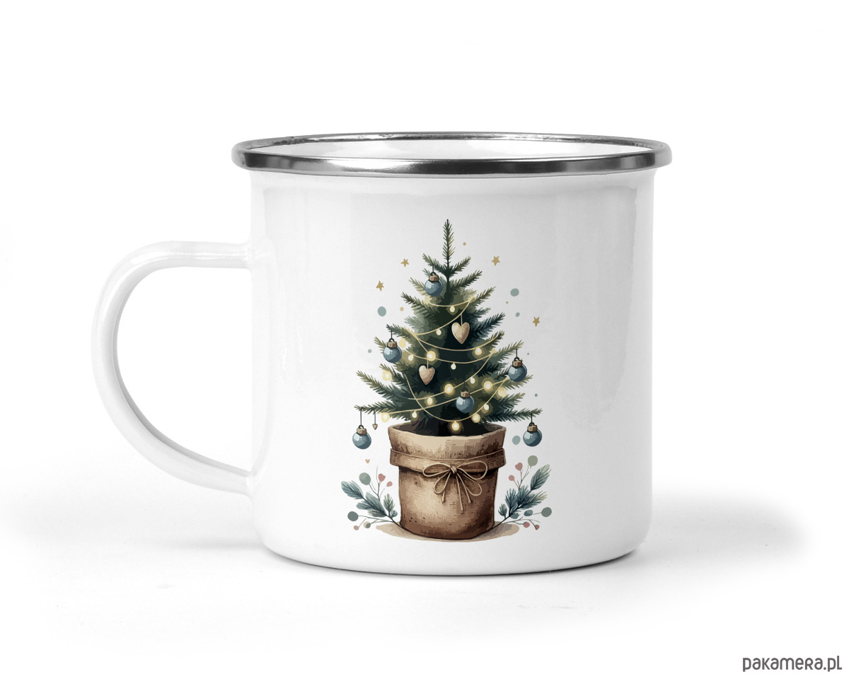Emaliowany kubek wraz z grafiką widoczną na zdjęciach.