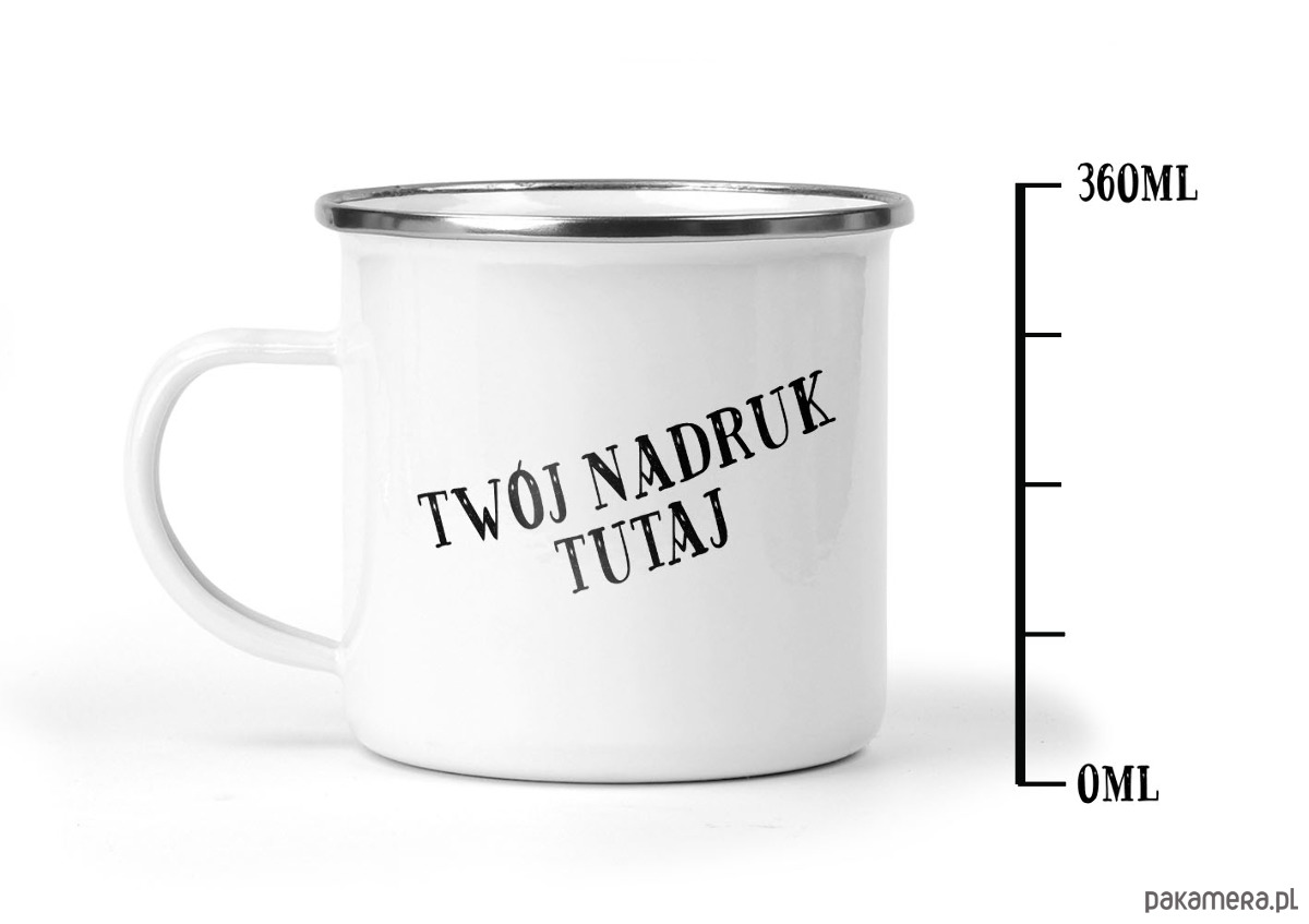 Emaliowany kubek wraz z grafiką widoczną na zdjęciach.
