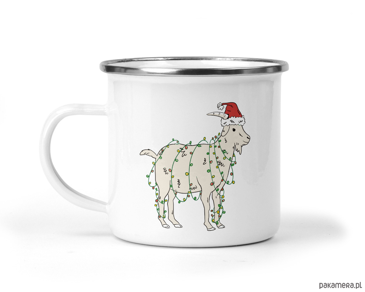 Emaliowany kubek wraz z grafiką widoczną na zdjęciach.