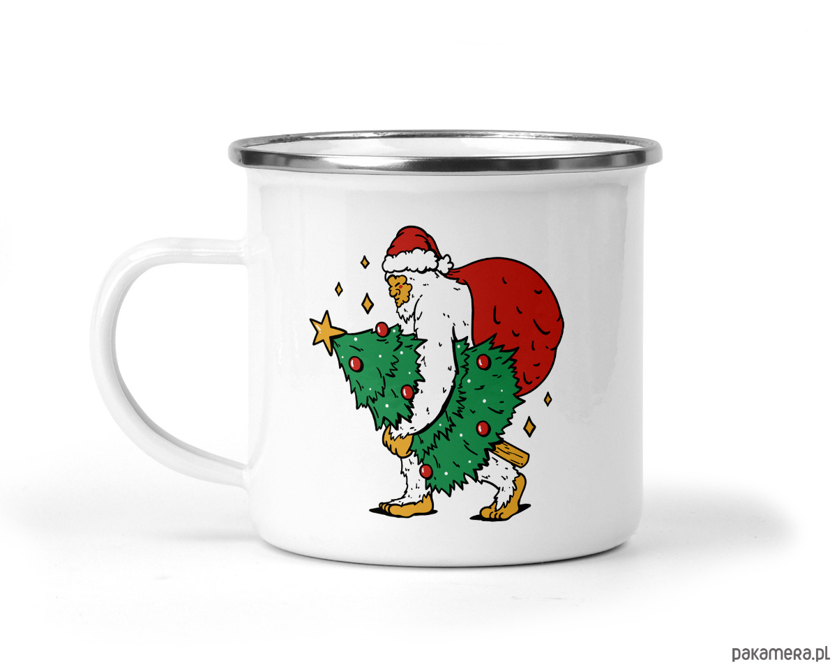 Emaliowany kubek wraz z grafiką widoczną na zdjęciach.