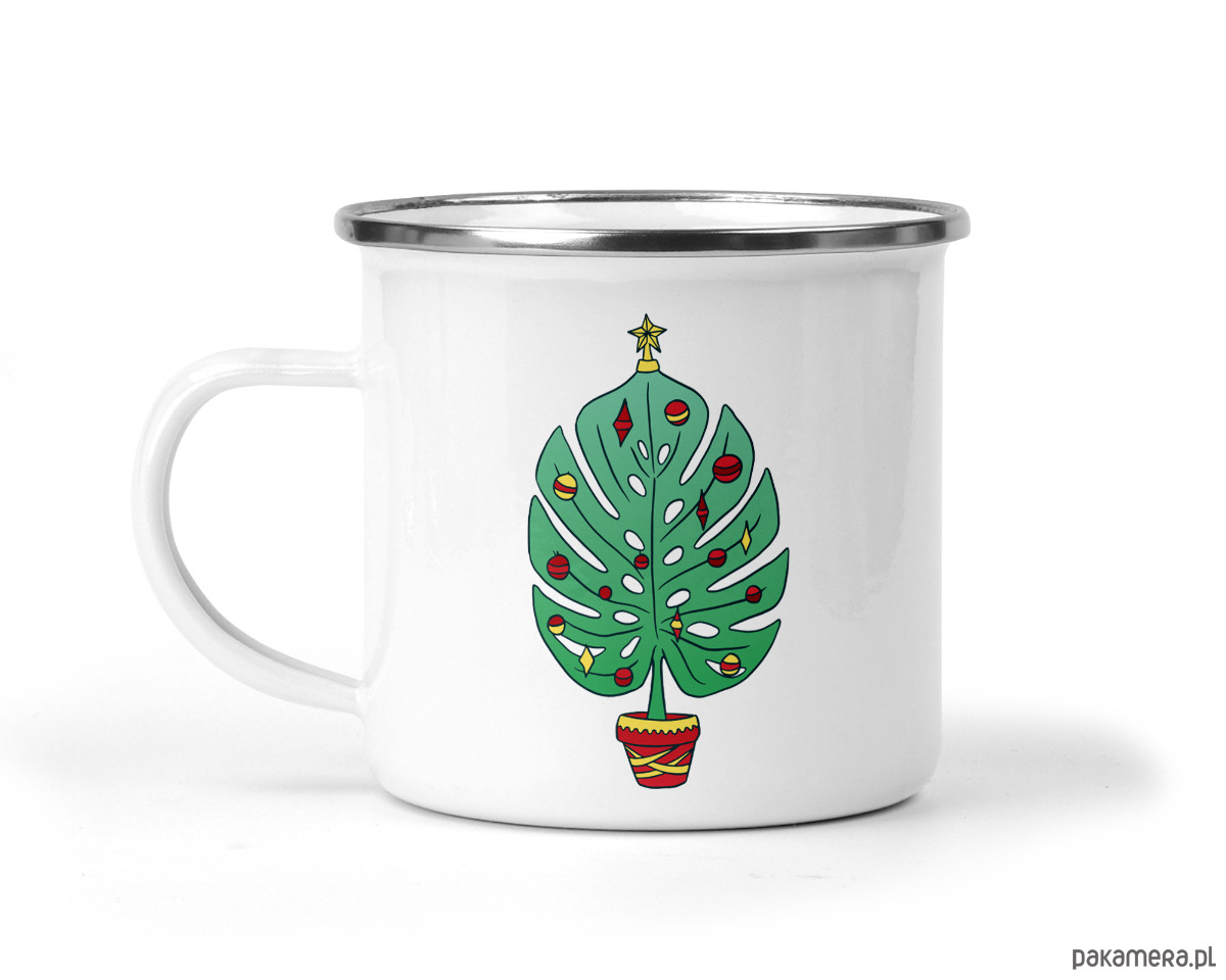 Emaliowany kubek wraz z grafiką widoczną na zdjęciach.