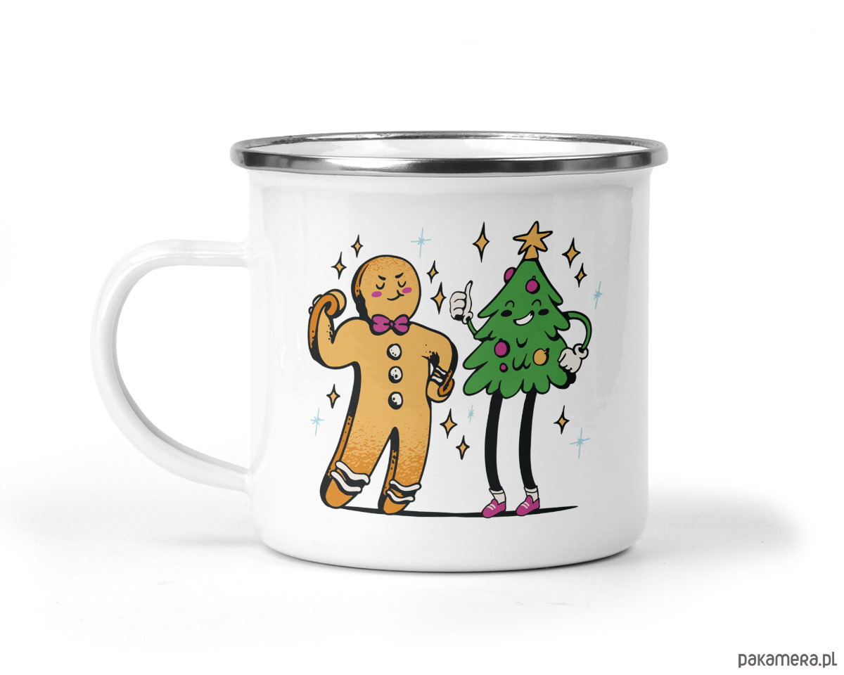 Emaliowany kubek wraz z grafiką widoczną na zdjęciach.