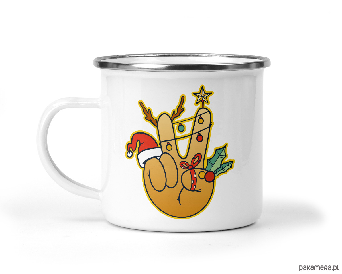Emaliowany kubek wraz z grafiką widoczną na zdjęciach.