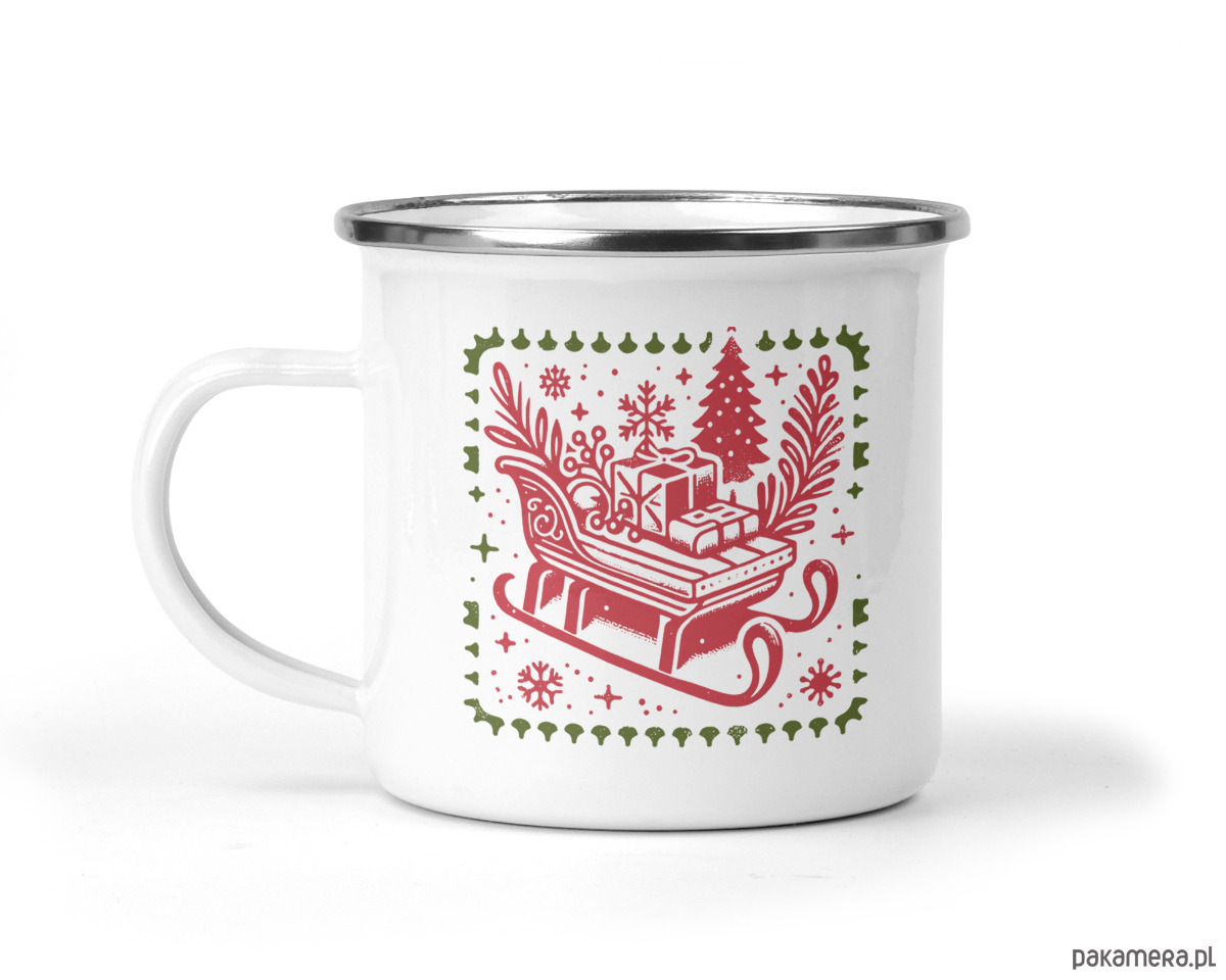 Emaliowany kubek wraz z grafiką widoczną na zdjęciach.