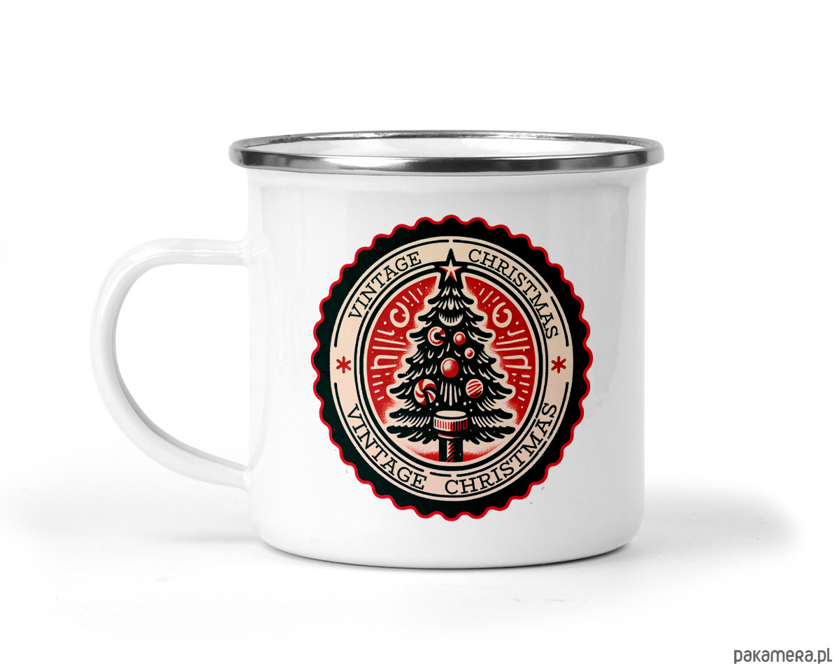 Emaliowany kubek wraz z grafiką widoczną na zdjęciach.