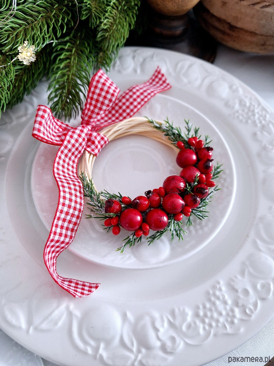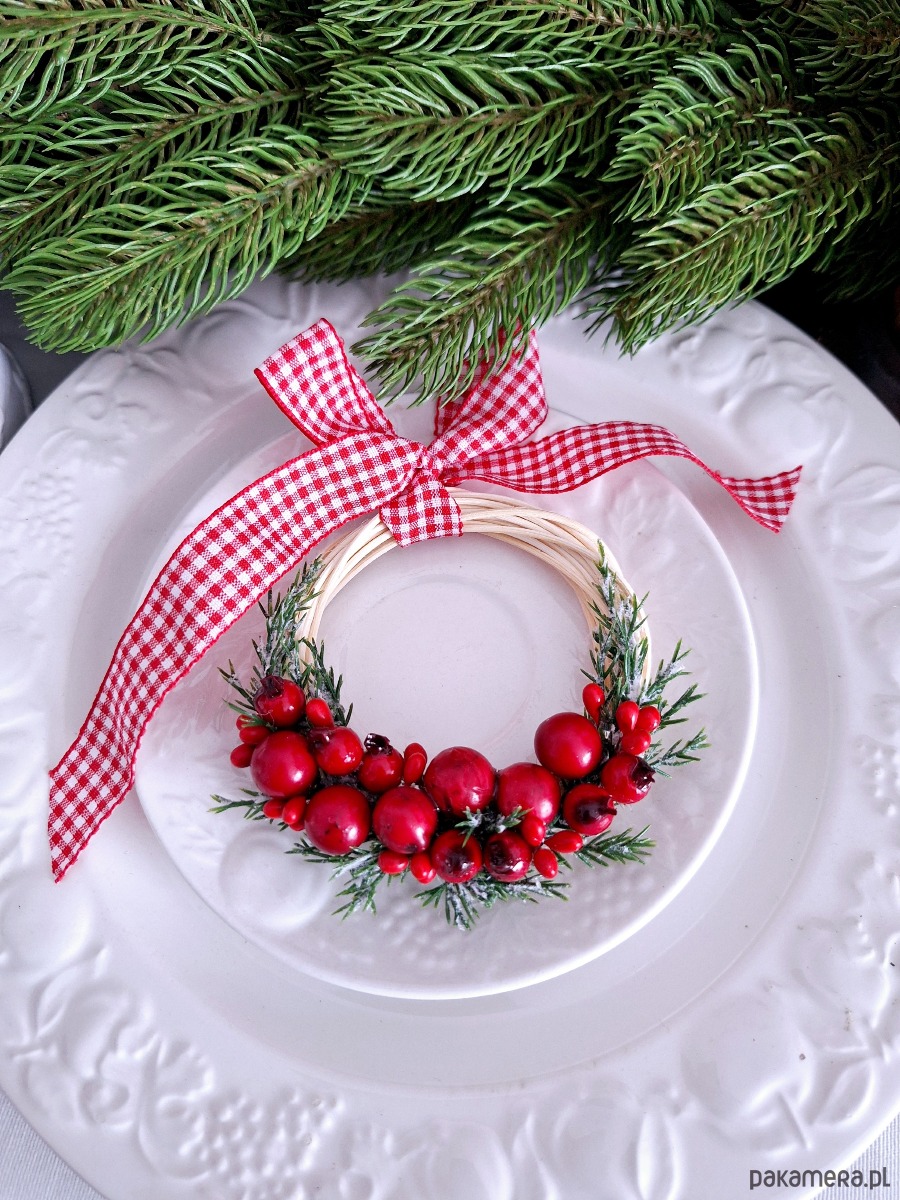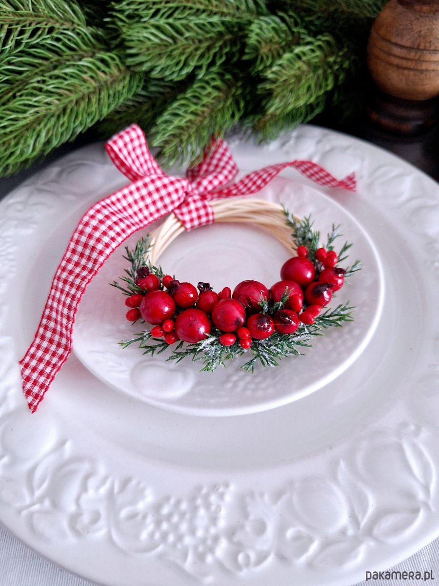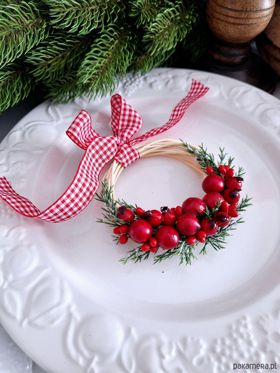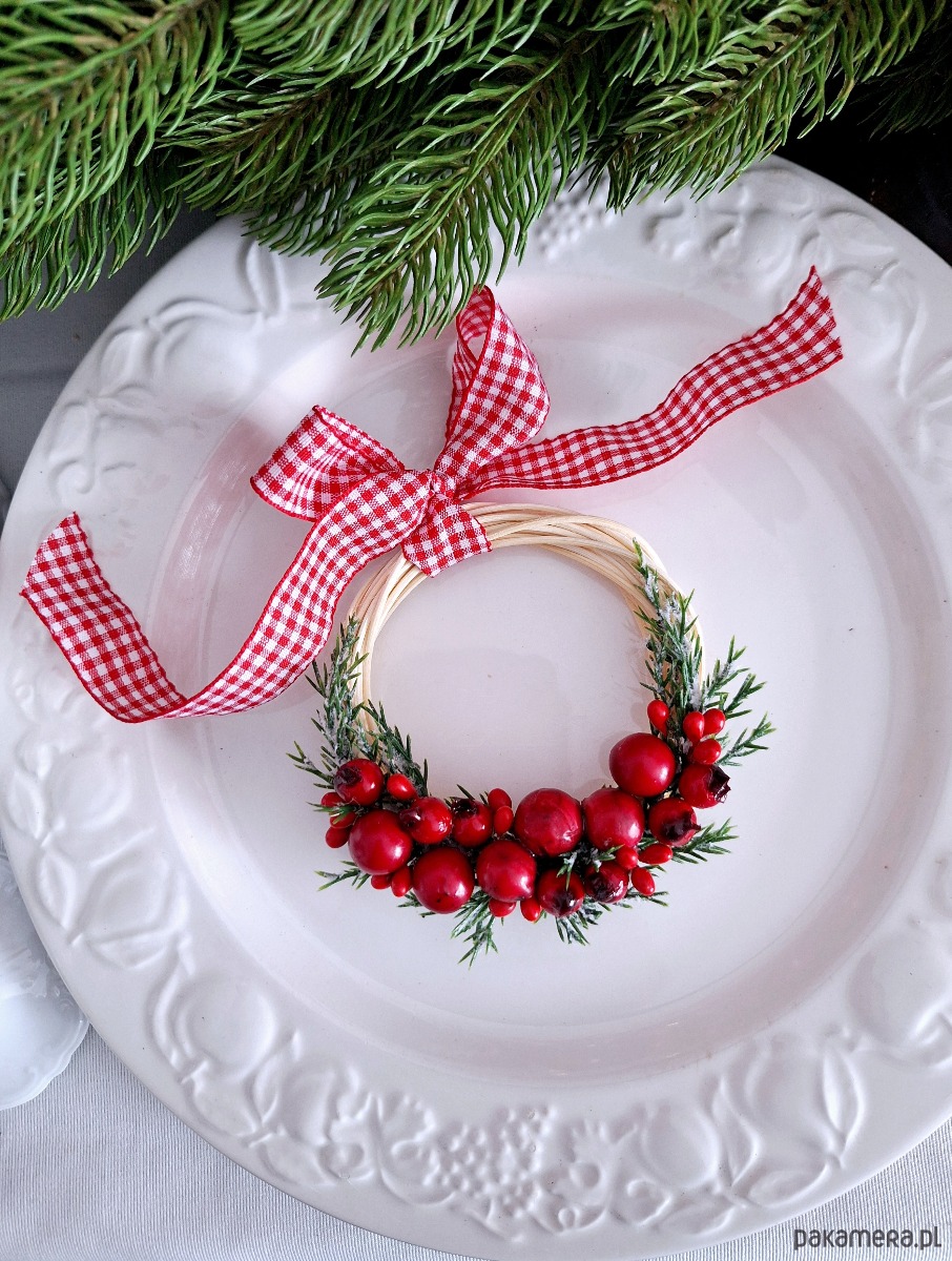 Dekoracyjny mini wianuszek świąteczny. Podstawa wianuszka wypleciona ręcznie, następnie zdobiona sztucznymi dekoracjami zielonymi i czerwonymi owocami, całość udekorowana dekoracyjną wstażką w kratkę biało- czerwoną.