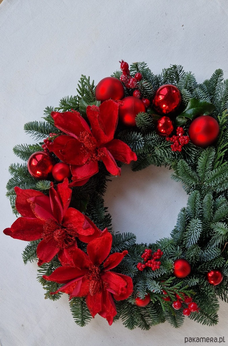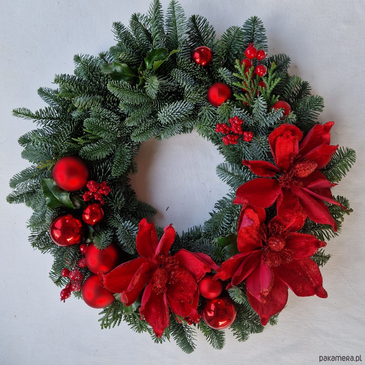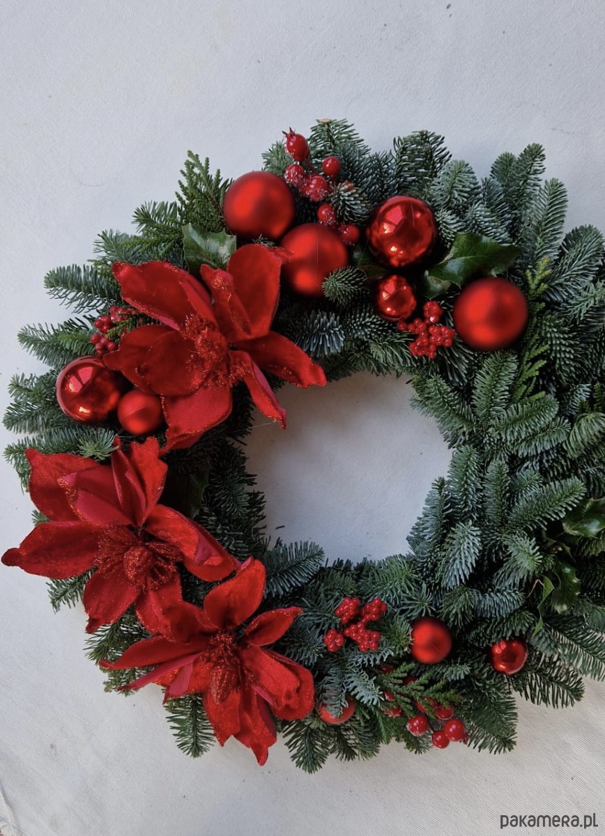 Wianek naturalny, wykonany z wysokiej jakości Jodły Nobilis. Dodatkiem są sztuczne, naturalnie wyglądające dekoracje.