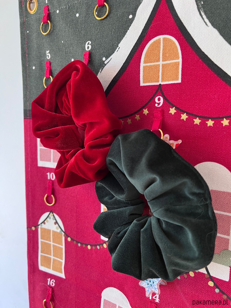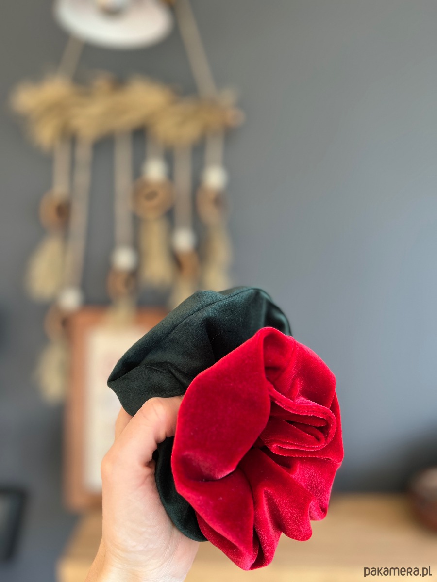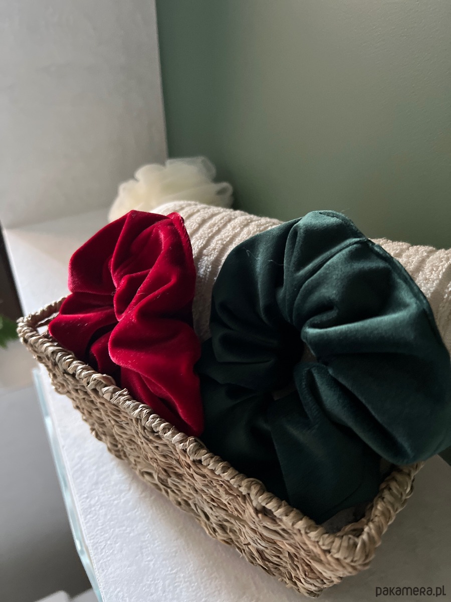 Aksamitna scrunchie w dwóch świątecznych kolorach: intensywna czerwień i głęboka zieleń. Wykonana z miękkiego, welwetowego materiału (velvet/aksamit), który minimalizuje łamanie i plątanie włosów — idealna na kucyk, kok czy jako ozdoba na nadgarstku.