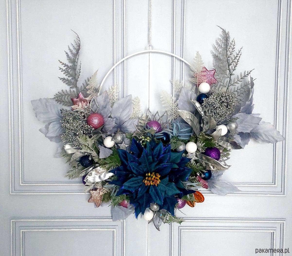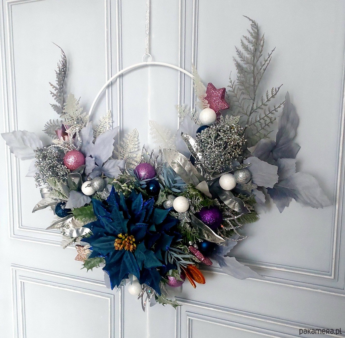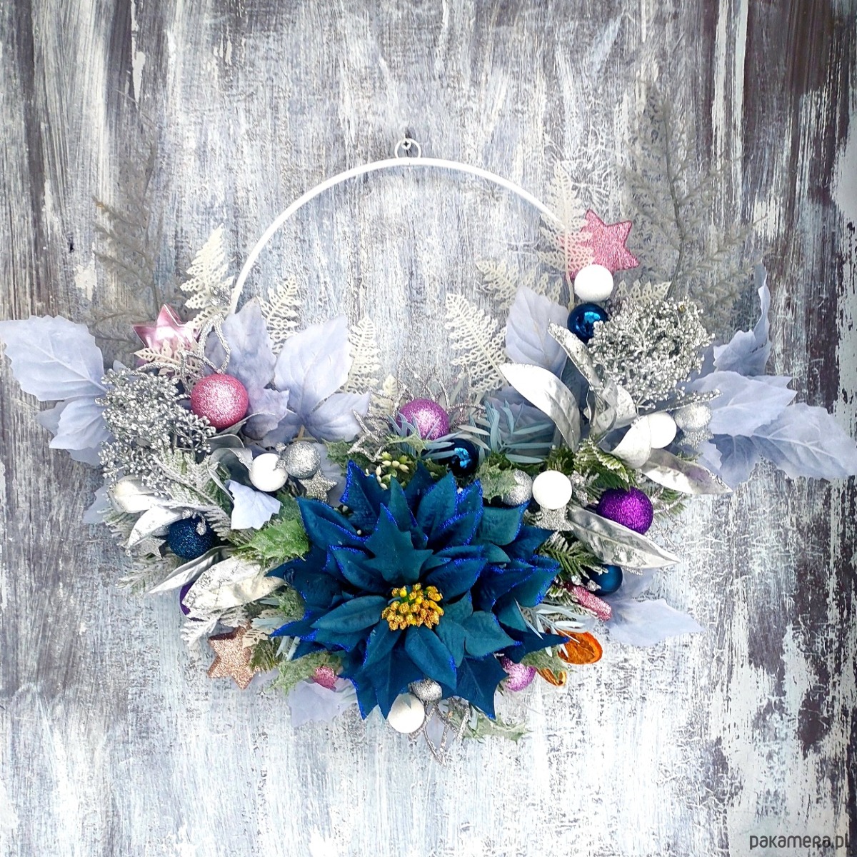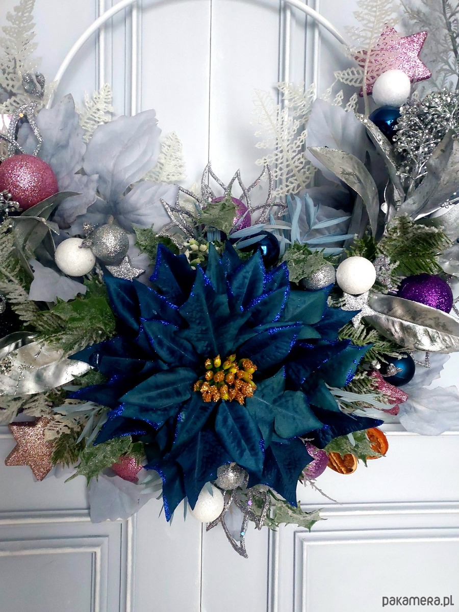 Jeśli byłeś w tym roku grzeczny i chcesz mieć pewność, że Mikołaj do Ciebie trafi, koniecznie daj mu jakiś znak! Z pewnością świetnym drogowskazem będzie dla niego ten oto świąteczny wianek powieszony np. na drzwiach :) Wianek na metalowej obręczy został udekorowany kompozycją z elementów w iście bożonarodzeniowym klimacie ✨ Średnica metalowego koła to 30 cm, całości ok 55x48 cm