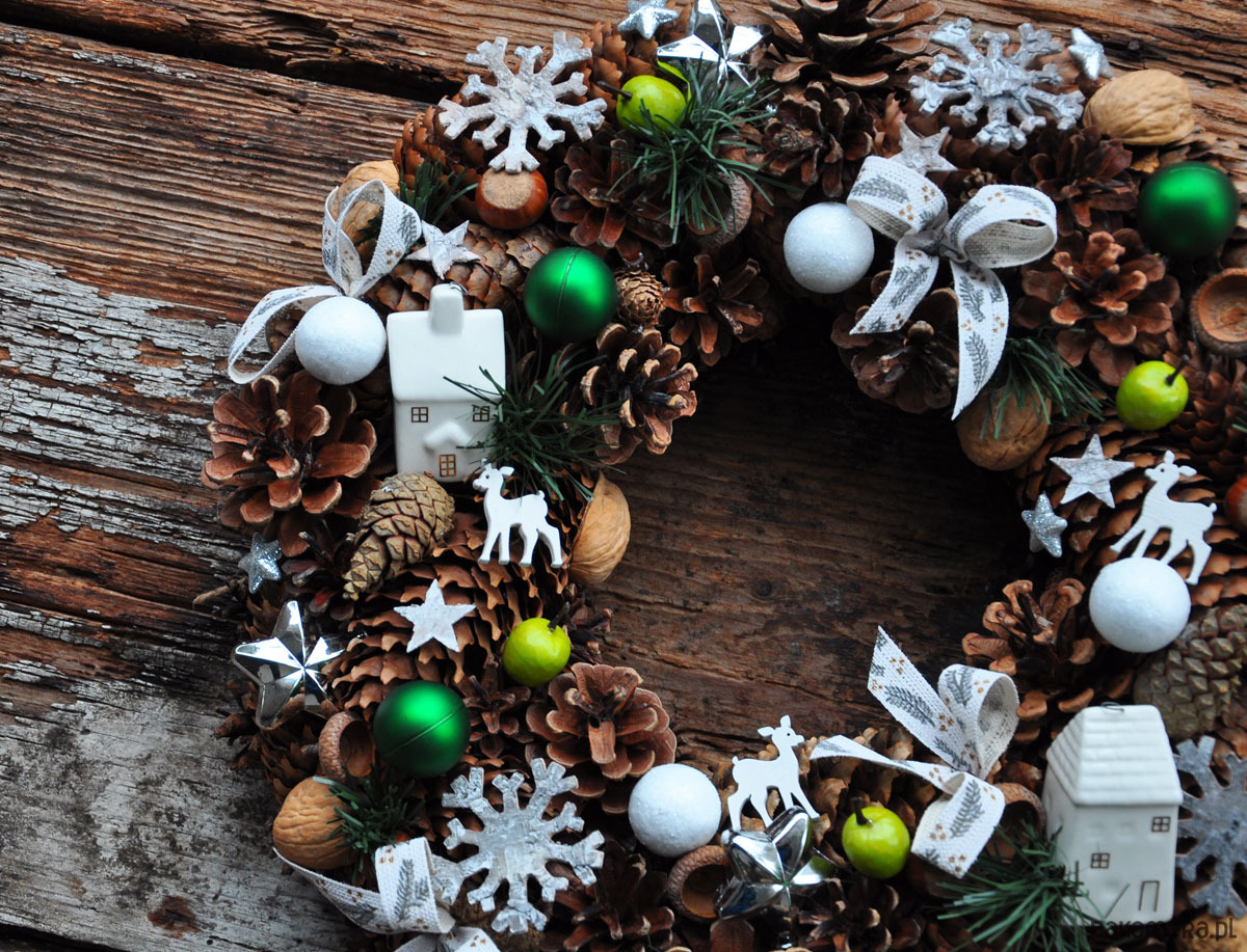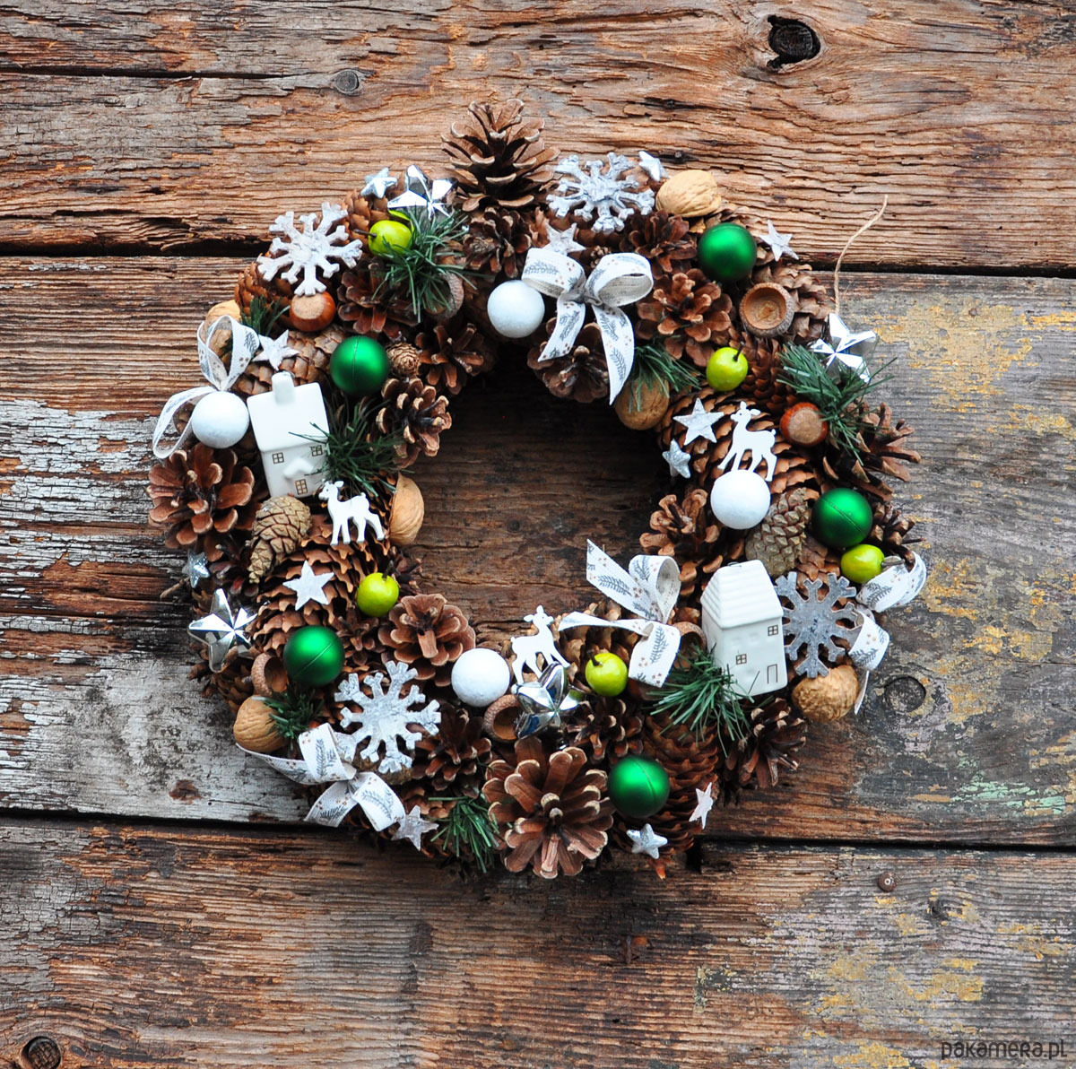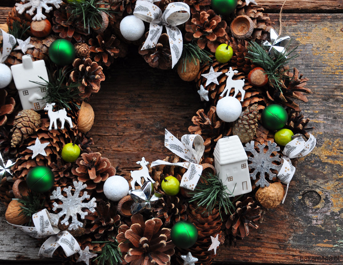 Piękny i wyjątkowy wianek świąteczny wykonany z kilku gatunków szyszek, ozdobiony porcelanowymi domkami, bombkami,drewnianymi serduszakmi, małymi sarenkami, gwiazdkami itd. ; średnica ok.40cm; wianek można powiesić na drzwiach lub położyć na stole ze świecą w środku; wykonany na słomianej bazie; odpowiednio przechowany posłuży przez kilka sezonów; wianki występują w pojedynczych egzemplarzach, nie ma możliwości powtórzenia wzoru; zapraszam serdecznie