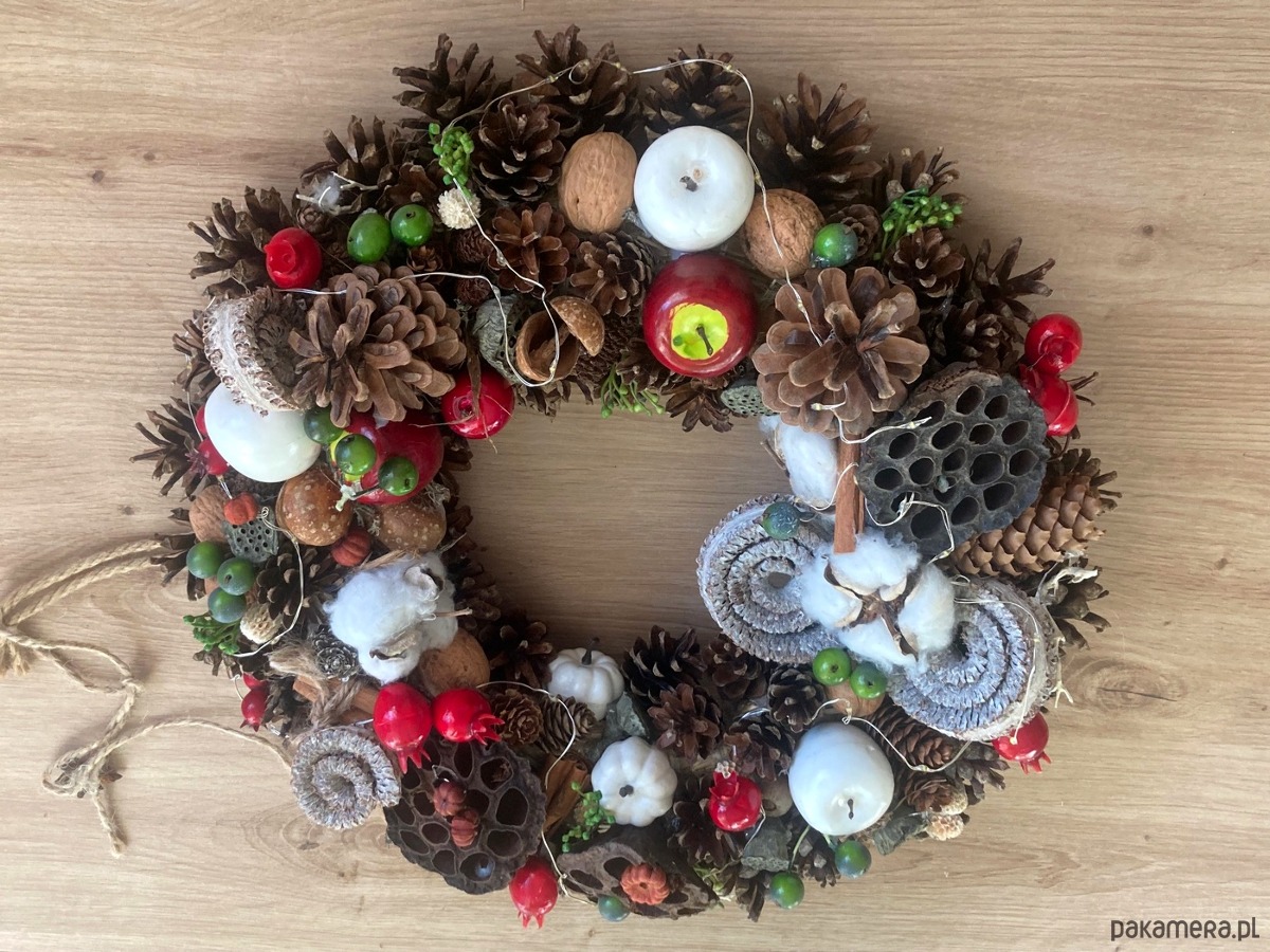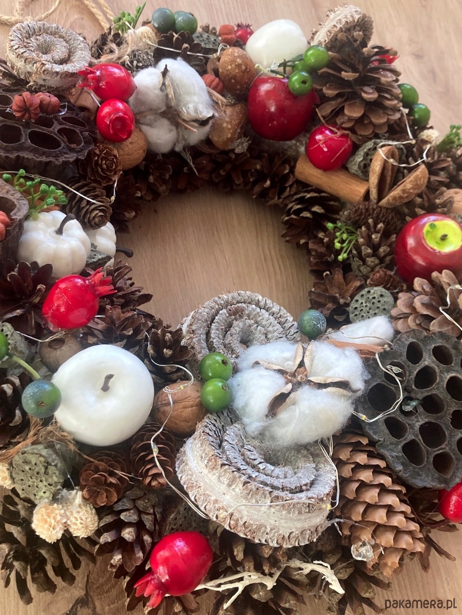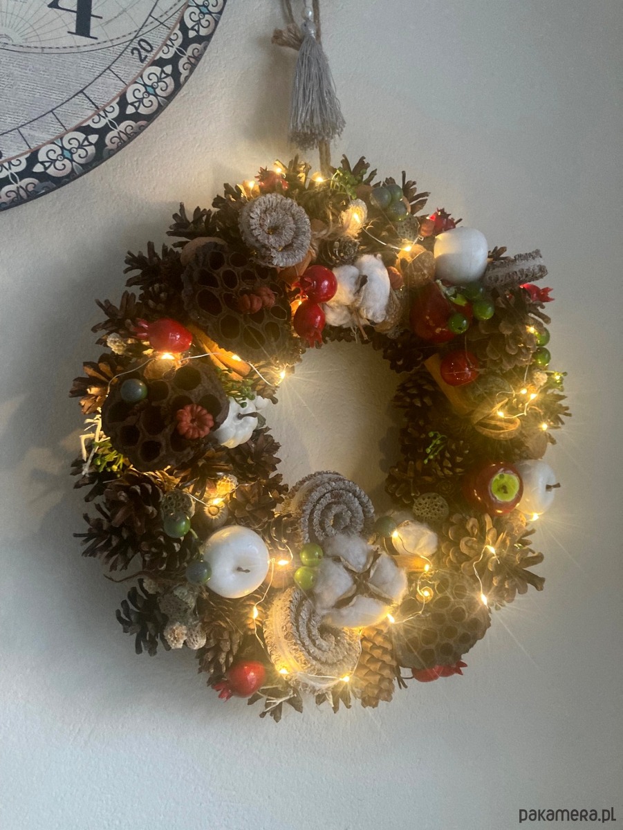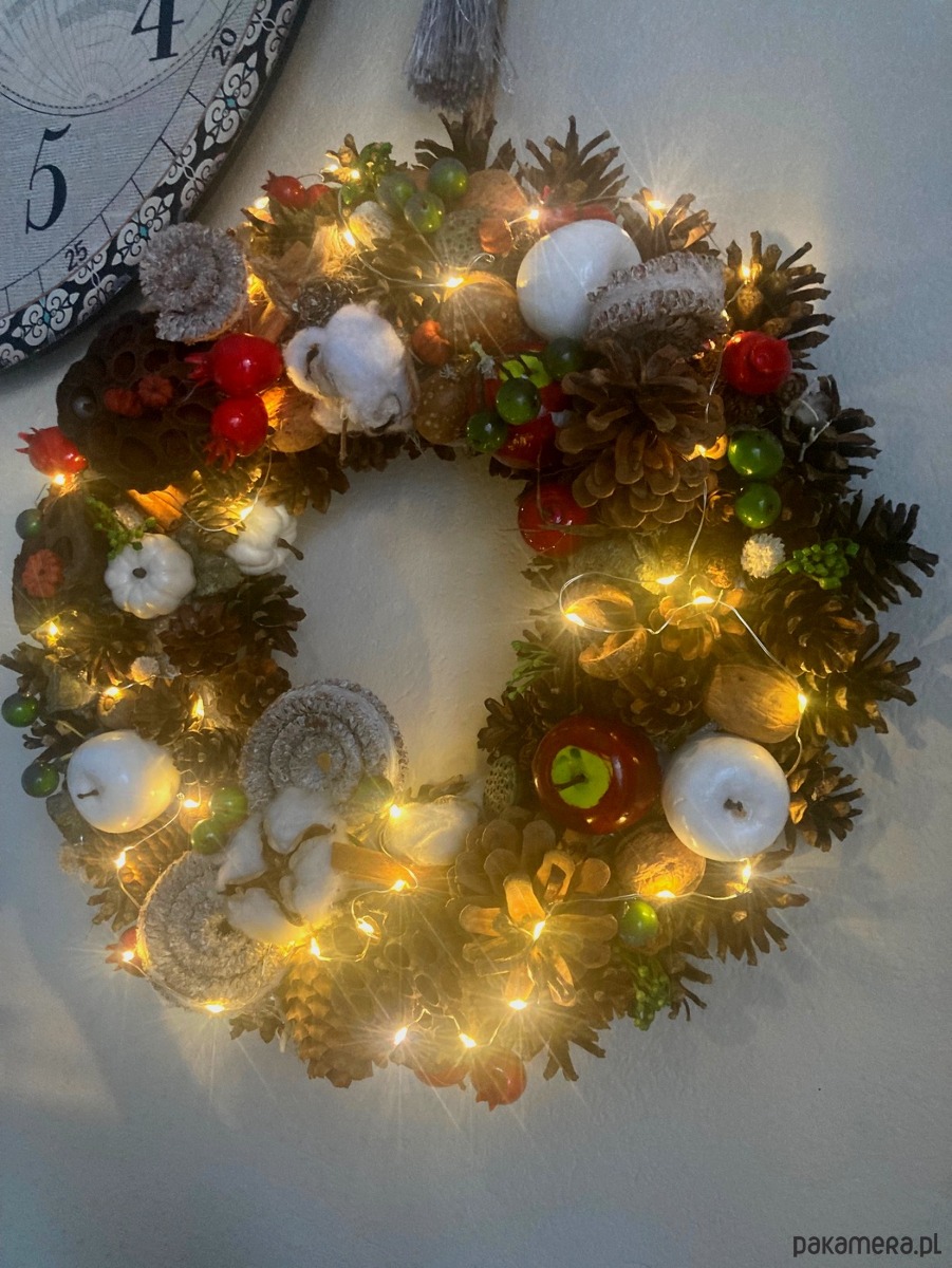 Wianek wykonany na podstawie ze słomy . Głownym elementem są naturalne szyszki , suszone kwiatostany, ozdobiony wysokiej jakości imitacjami owoców. Wianek posiada delikatne oświetlenie.