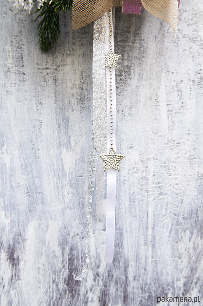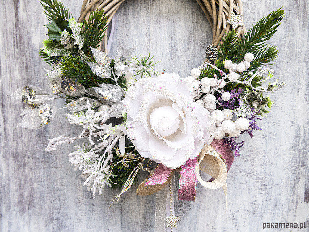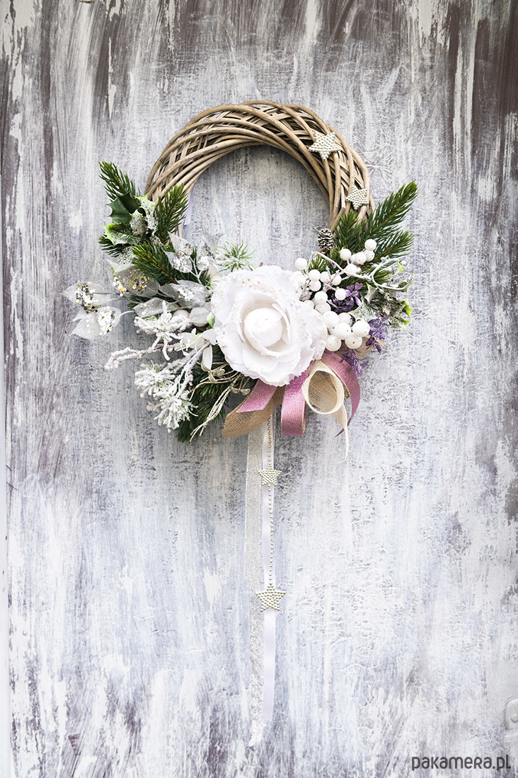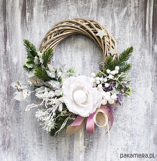 Jeśli byłeś w tym roku grzeczny i chcesz mieć pewność, że Mikołaj do Ciebie trafi, koniecznie daj mu jakiś znak! Z pewnością świetnym drogowskazem będzie dla niego ten oto świąteczny wianek powieszony np. na drzwiach :) Wiklinowy wianek został udekorowany kompozycją z elementów w iście bożonarodzeniowym klimacie, a białe kwiaty delikatnie skrzą dodając wiankowi świątecznej iskierki Średnica samego wiklinowego wianka to ok. 30 cm, razem z kompozycją ok. 38 cm
