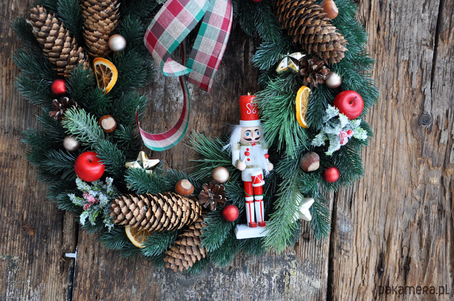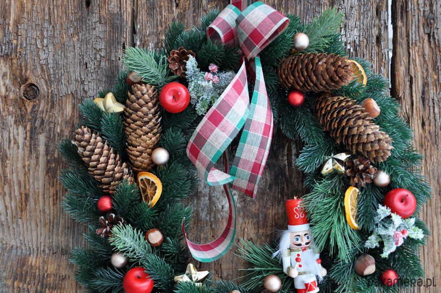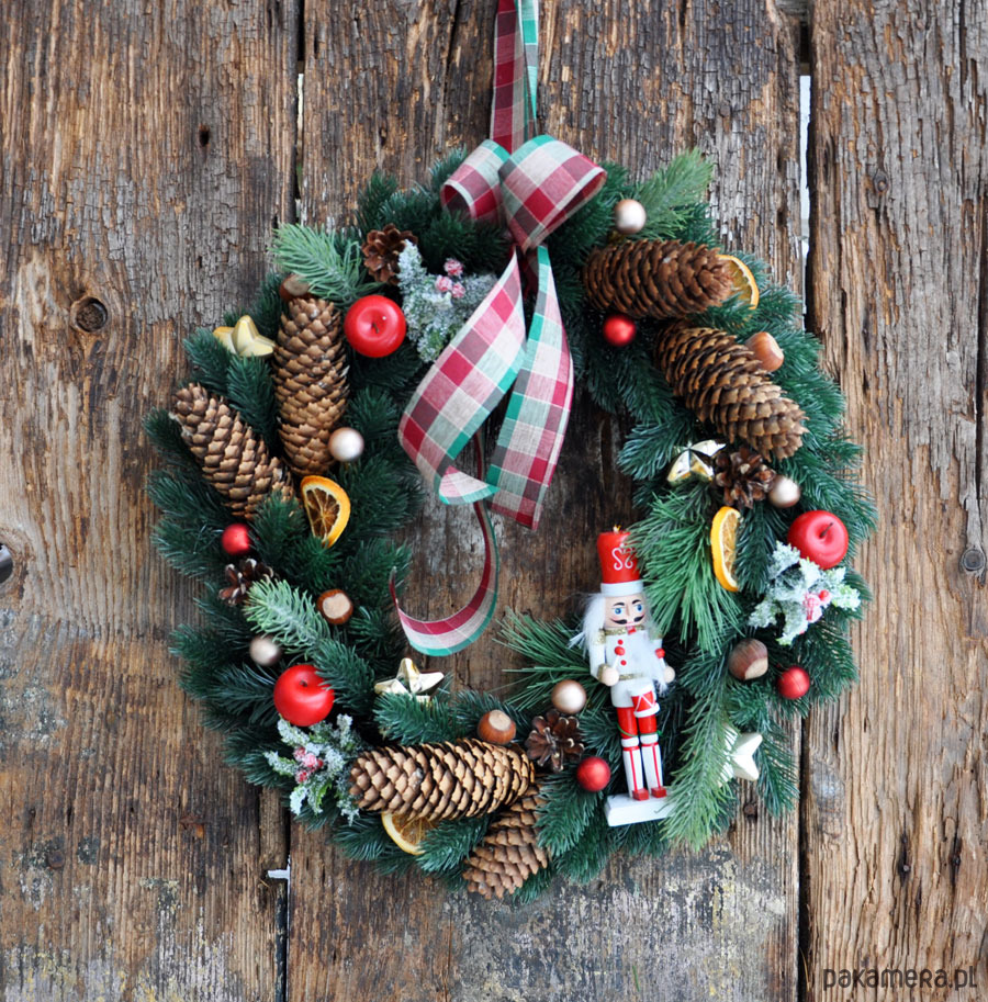 Piękny i wyjątkowy wianek świąteczny ze sztucznych gałązek iglaków, ozdobiony dziadkiem do orzechów, orzechami, plasterkami pomarańczy, tasiemkami, jabłuszkami, szyszkami itd. ; średnica ok.45cm; wianek jest przystosowany do powieszenia; odpowiednio przechowany posłuży przez kilka sezonów; wianki występują w pojedynczych egzemplarzach, nie ma możliwości powtórzenia wzoru; zapraszam serdecznie