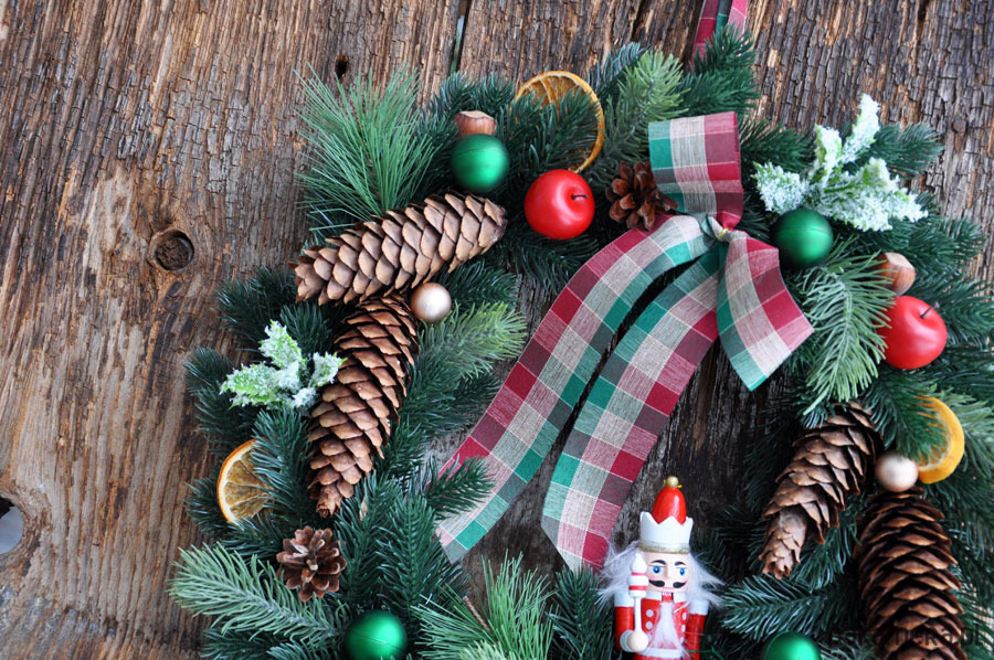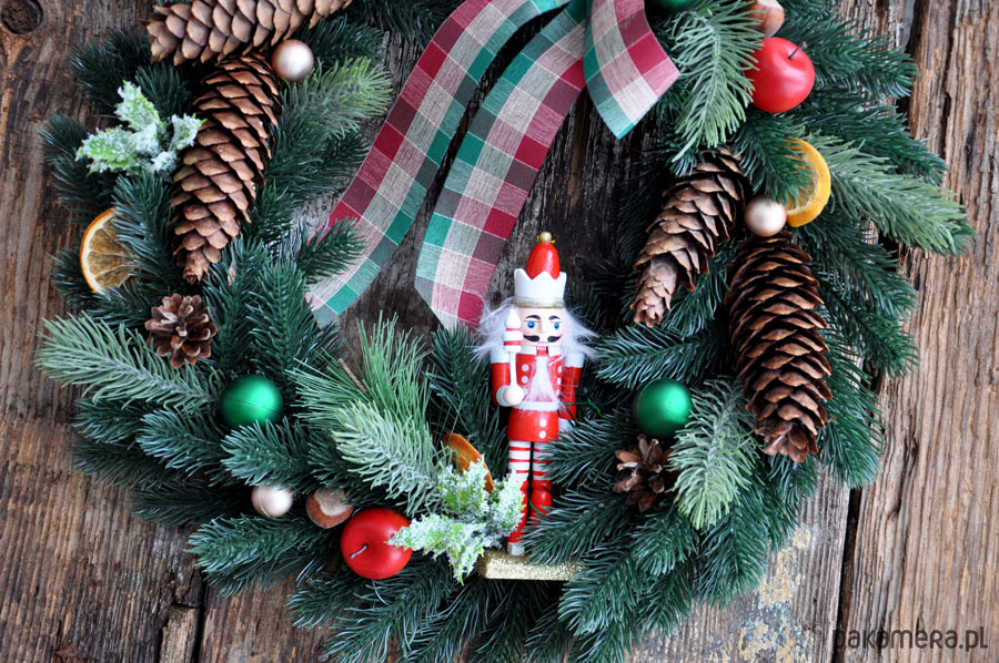 Piękny i wyjątkowy wianek świąteczny ze sztucznych gałązek iglaków, ozdobiony dziadkiem do orzechów, orzechami, plasterkami pomarańczy, tasiemkami, jabłuszkami, szyszkami itd. ; średnica ok.45cm; wianek jest przystosowany do powieszenia; odpowiednio przechowany posłuży przez kilka sezonów; wianki występują w pojedynczych egzemplarzach, nie ma możliwości powtórzenia wzoru; zapraszam serdecznie