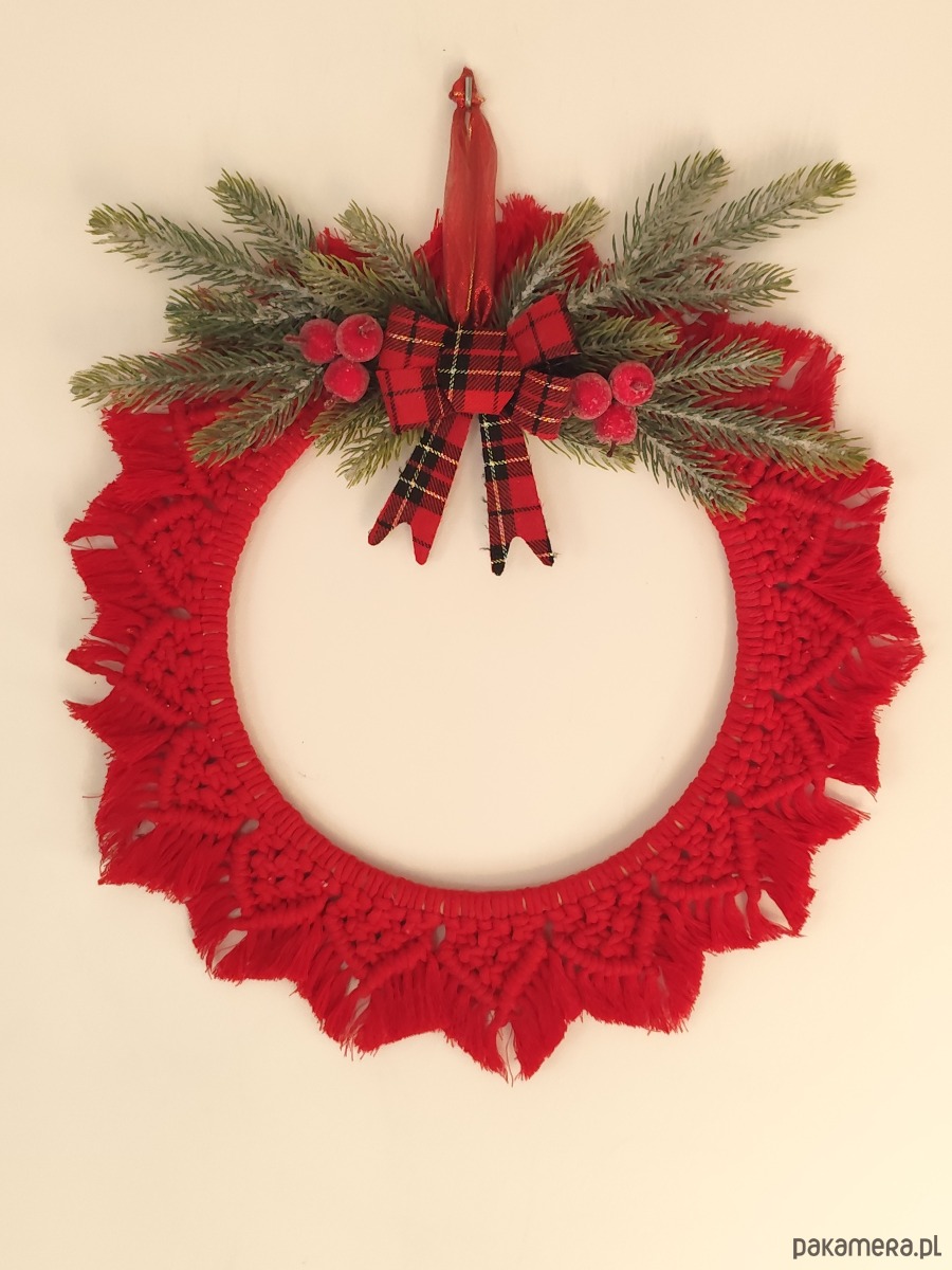 Ręcznie pleciony wianek z makramy w swiatecznym czerwonym kolorze, ozdobiony gałązkami świerka premium oraz mrozonymi jabłuszka mi i czerwoną kokardą. Połączenie miękkiego sznurka i świątecznych gałązek tworzy wyjątkową, ciepłą dekorację w stylu boho.
