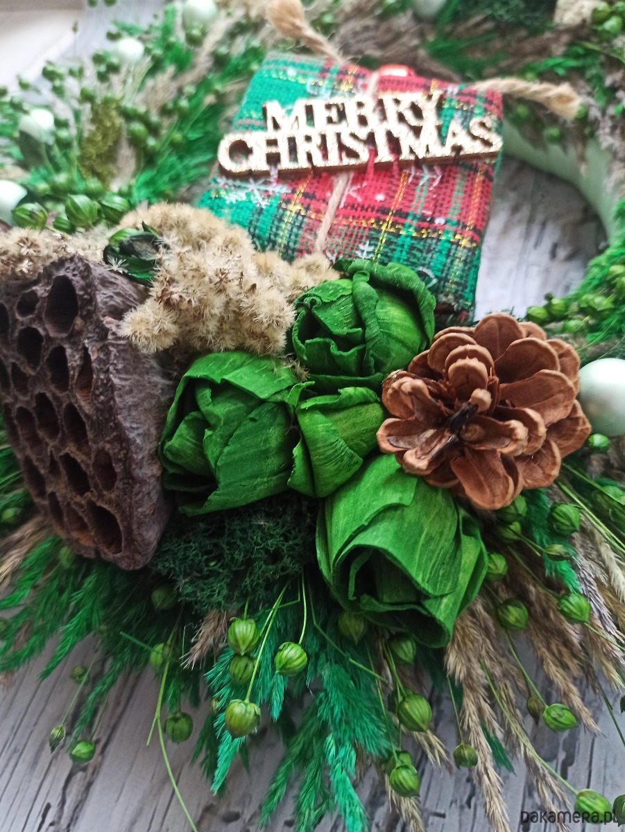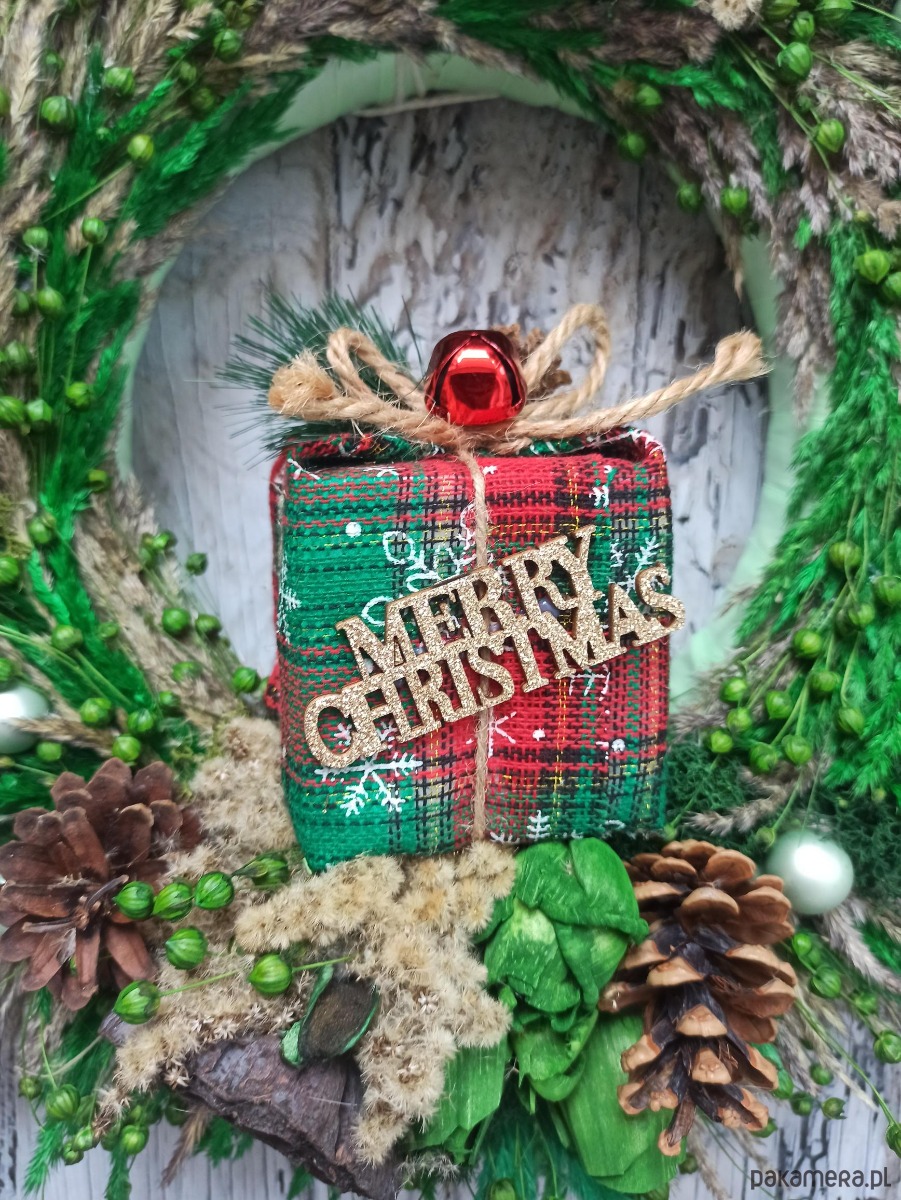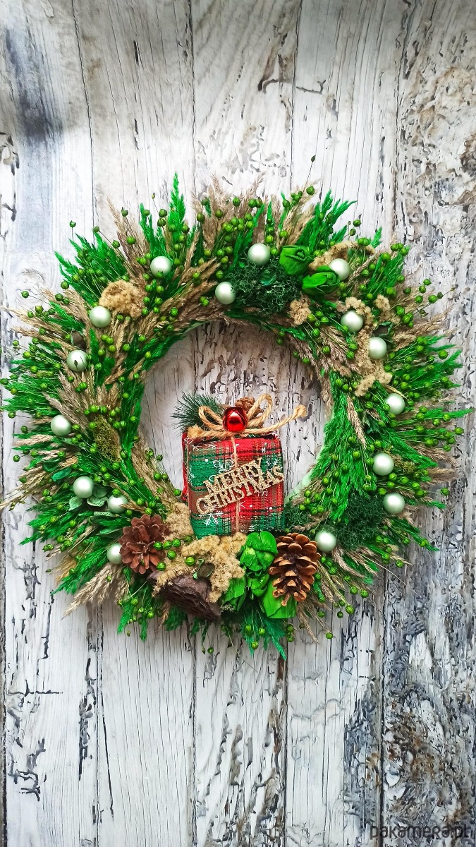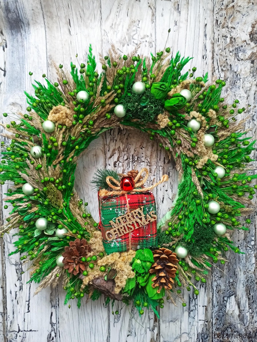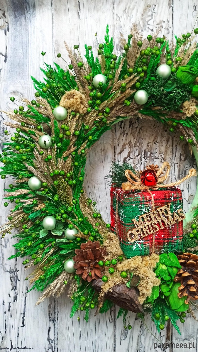 Świąteczny wieniec w zieleni, wianek z prezentem, #S1, 45 cm
