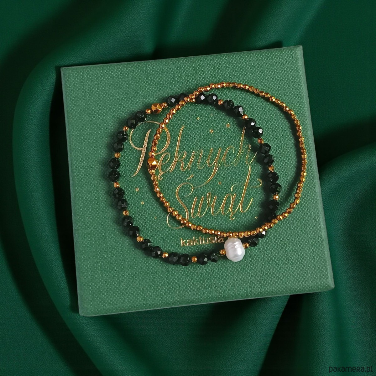 Świąteczny zestaw bransoletek : ciemna zieleń, złoto, perła : szmaragd nilu