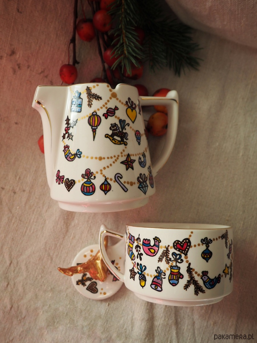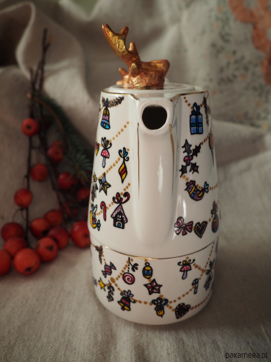 Ręcznie malowany zestaw czajniczek + filiżanka będzie doskonałym podarunkiem dla osoby kochającej zimę i nastrój świąt. Zestaw składa się z czterech części: imbryka, pokrywki i filiżanki z metalowym zaparzaczem.