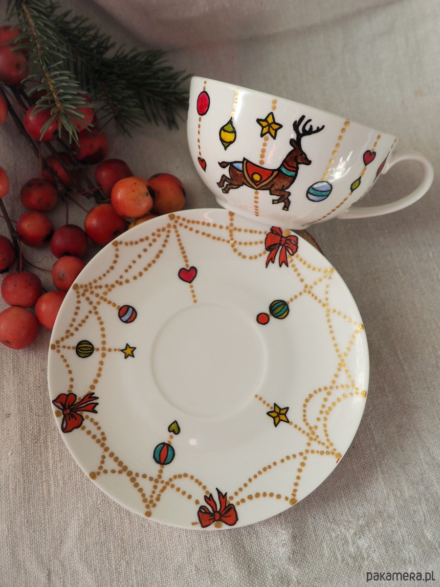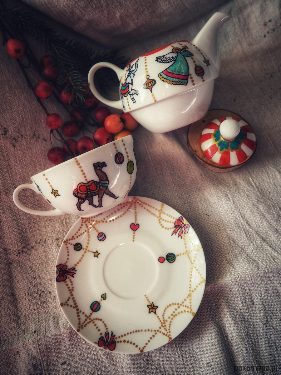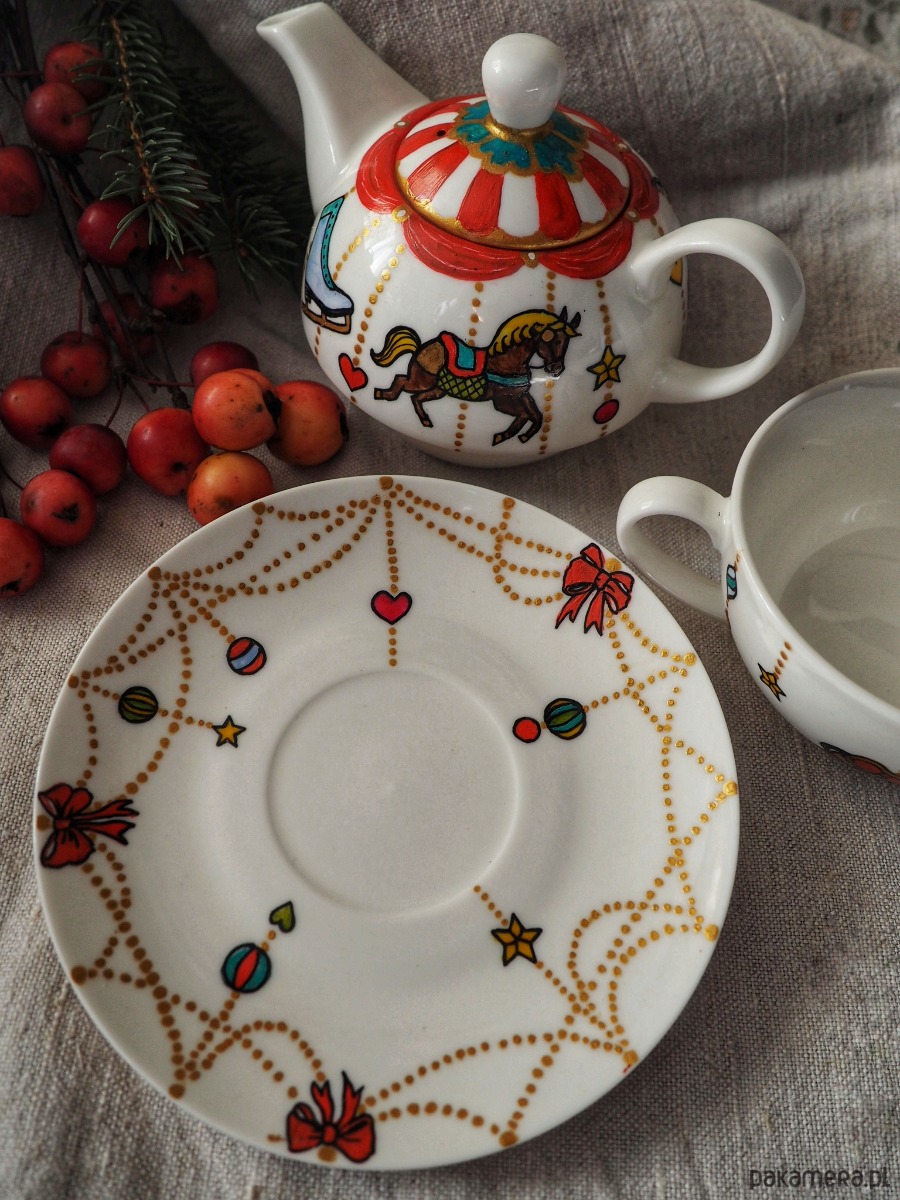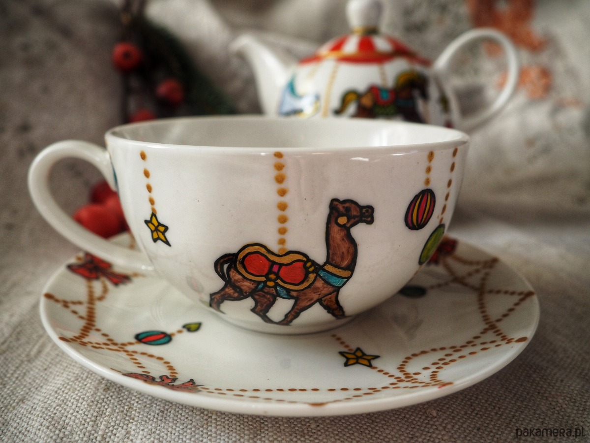 Wzór świątecznej karuzeli wykonany został przy użyciu nietoksycznych farb do porcelany, jest wodoodporny - naczynie może być myte ręcznie, bez użycia ostrych narzędzi.