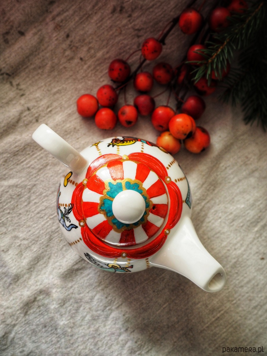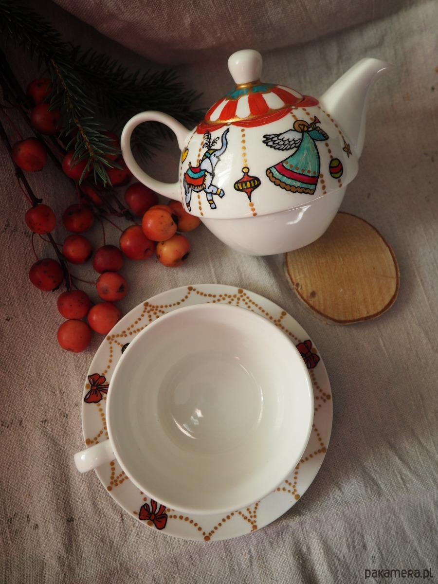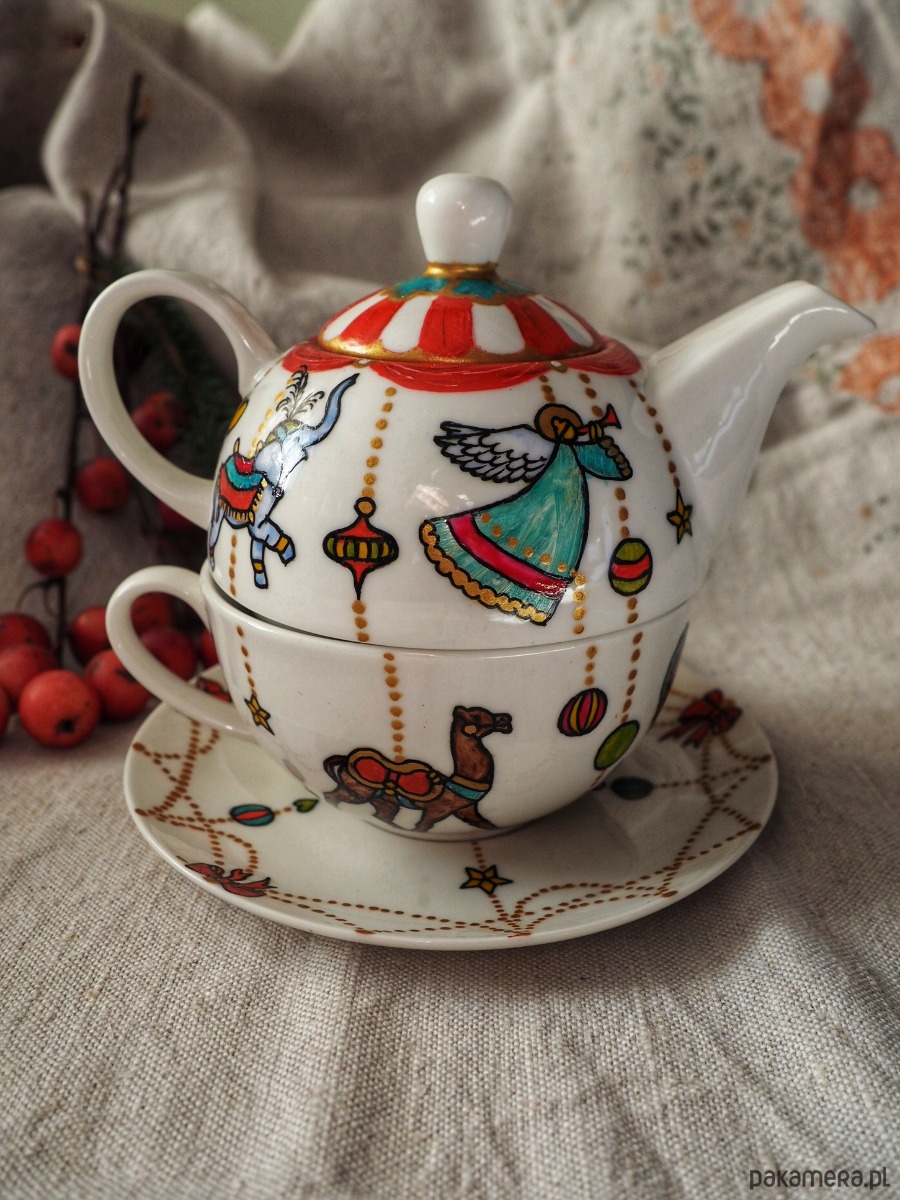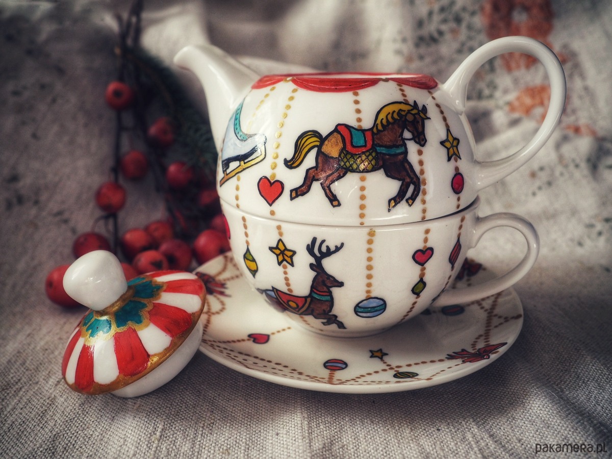 Ręcznie malowany zestaw czajniczek + filiżanka będzie doskonałym podarunkiem dla osoby kochającej zimę i nastrój świąt. Zestaw składa się z czterech części: imbryka, pokrywki i filiżanki ze spodkiem.