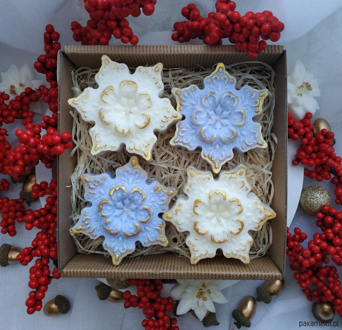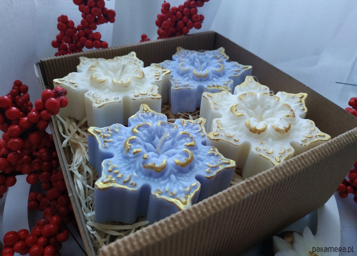 Zestaw czterech świec sojowych gwiazdek o zapachu marcepanu.