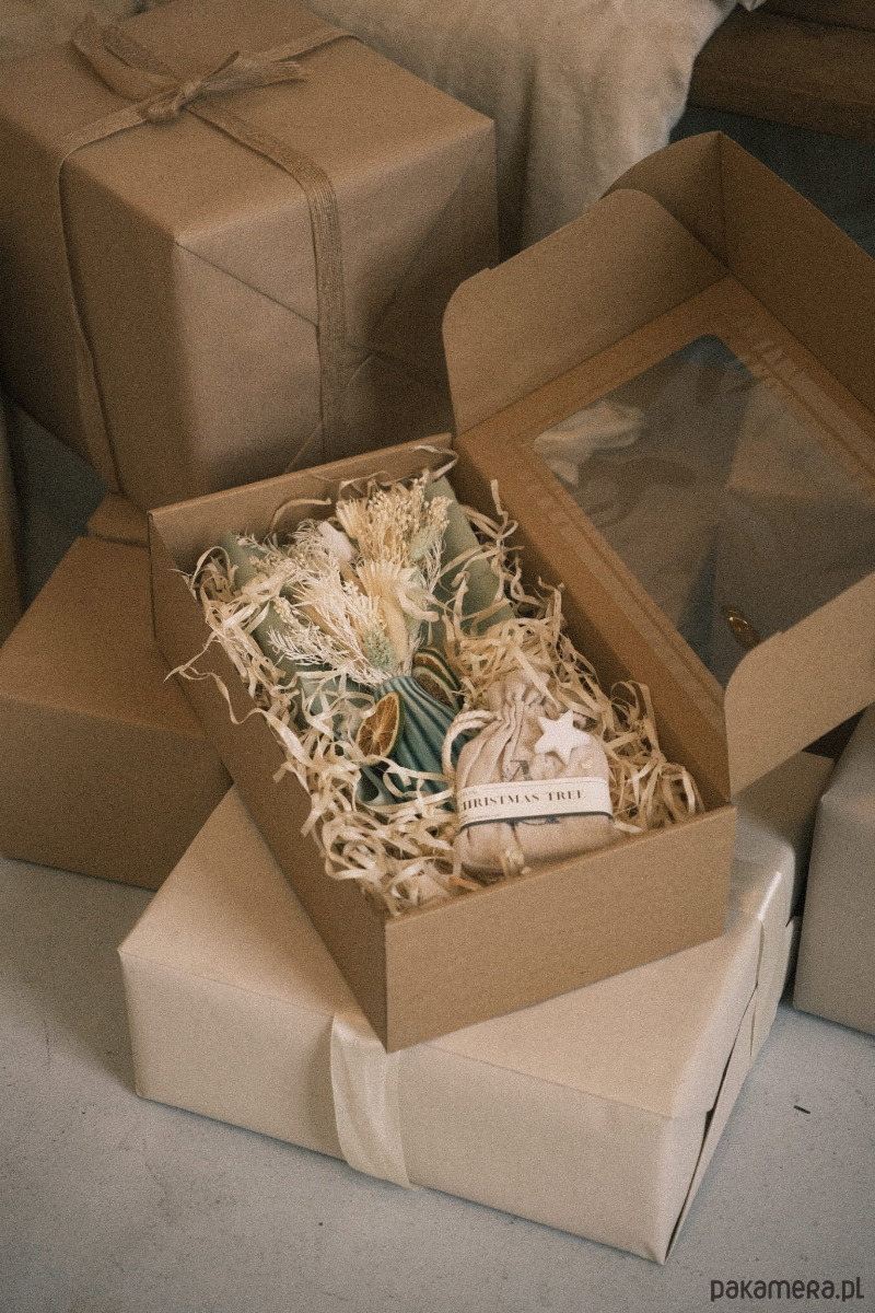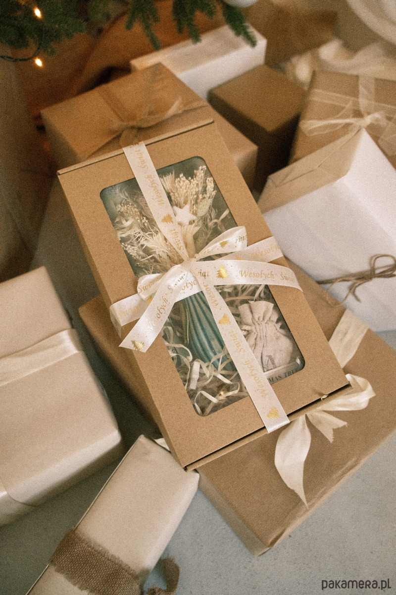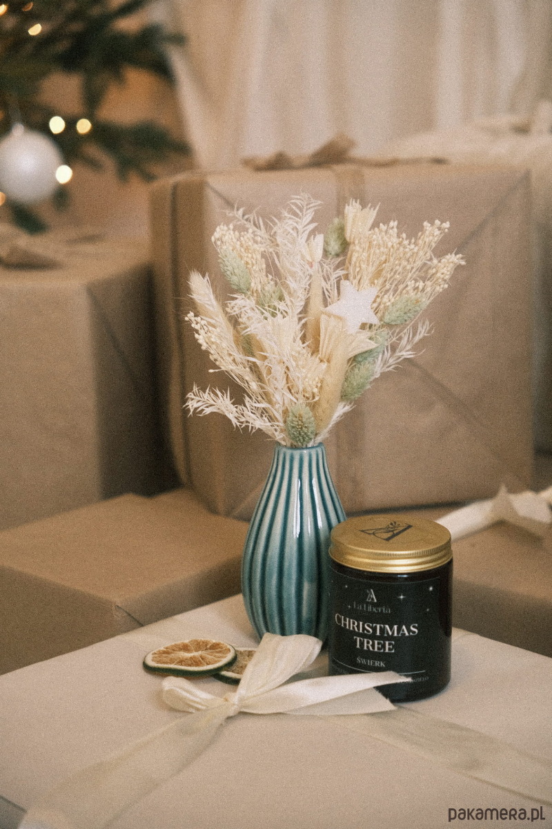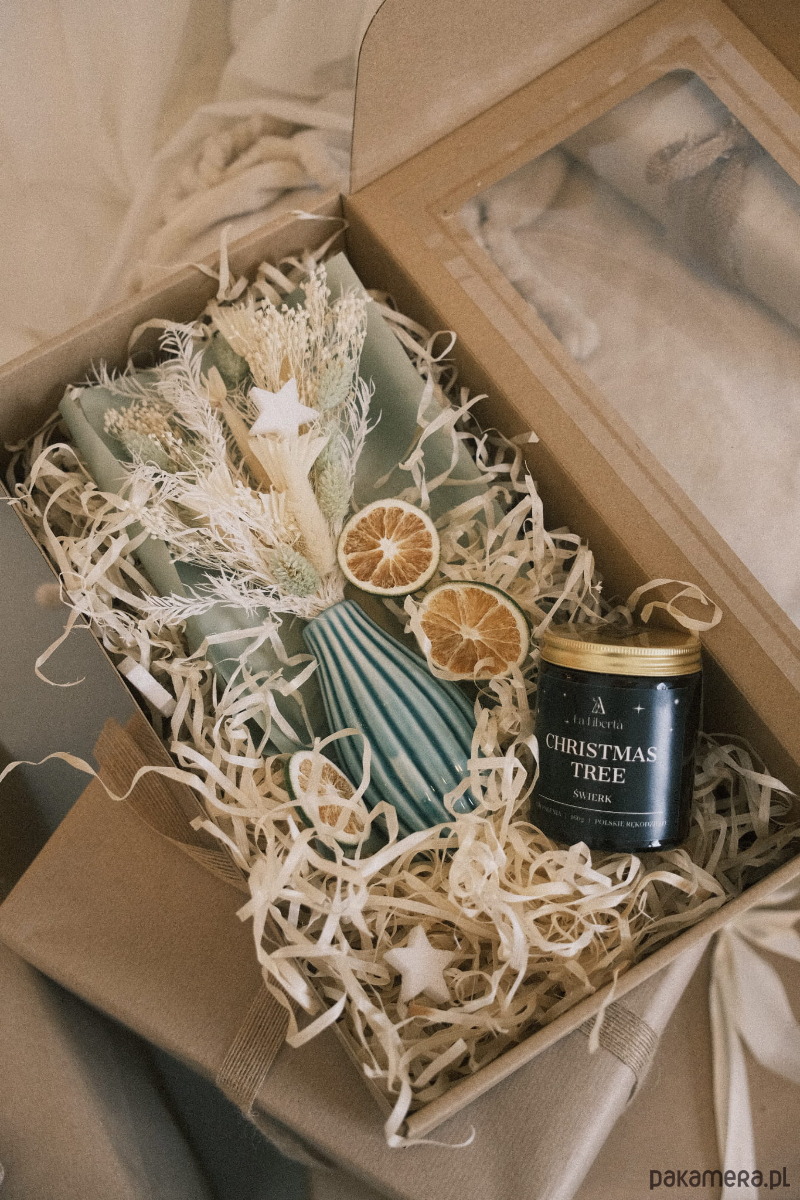 Świąteczny zestaw prezentowy „Pino” - bukiecik z suszonych roślin + wosk lub świeca