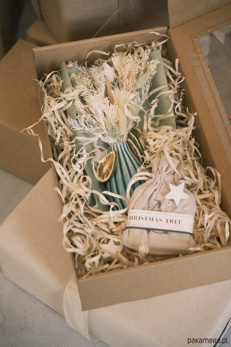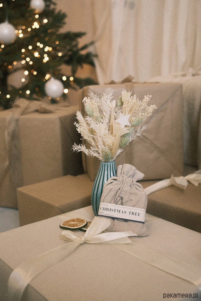 Świąteczny zestaw prezentowy „Pino” łączy wazonik z bukiecikiem z suszonych roślin oraz jeden wybrany produkt zapachowy.