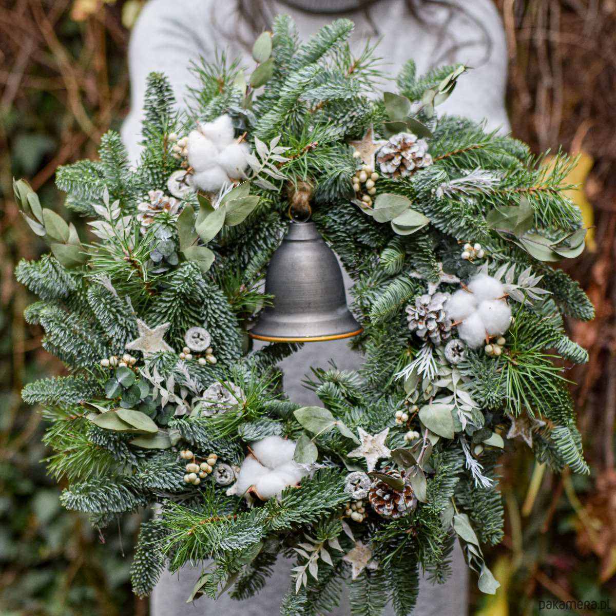 Każdy wianek wyplatam sama ręcznie na słomianym podkładzie. Wykonany jest z żywych gałązek, między innymi są to gałązki jodły Nobilis. Gałązki ładnie się zasuszą( nie obsypują się ) i taki wianek będzie piękną ozdobą przez cały zimowy czas. Do dekoracji zostały użyte naturalne ozdoby, piękna drewniana gwiazda i metalowe dzwonki w rdzawej barwie