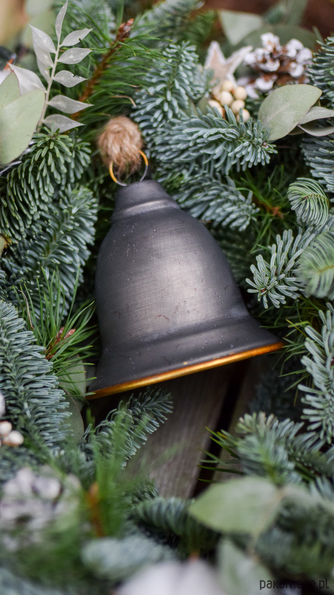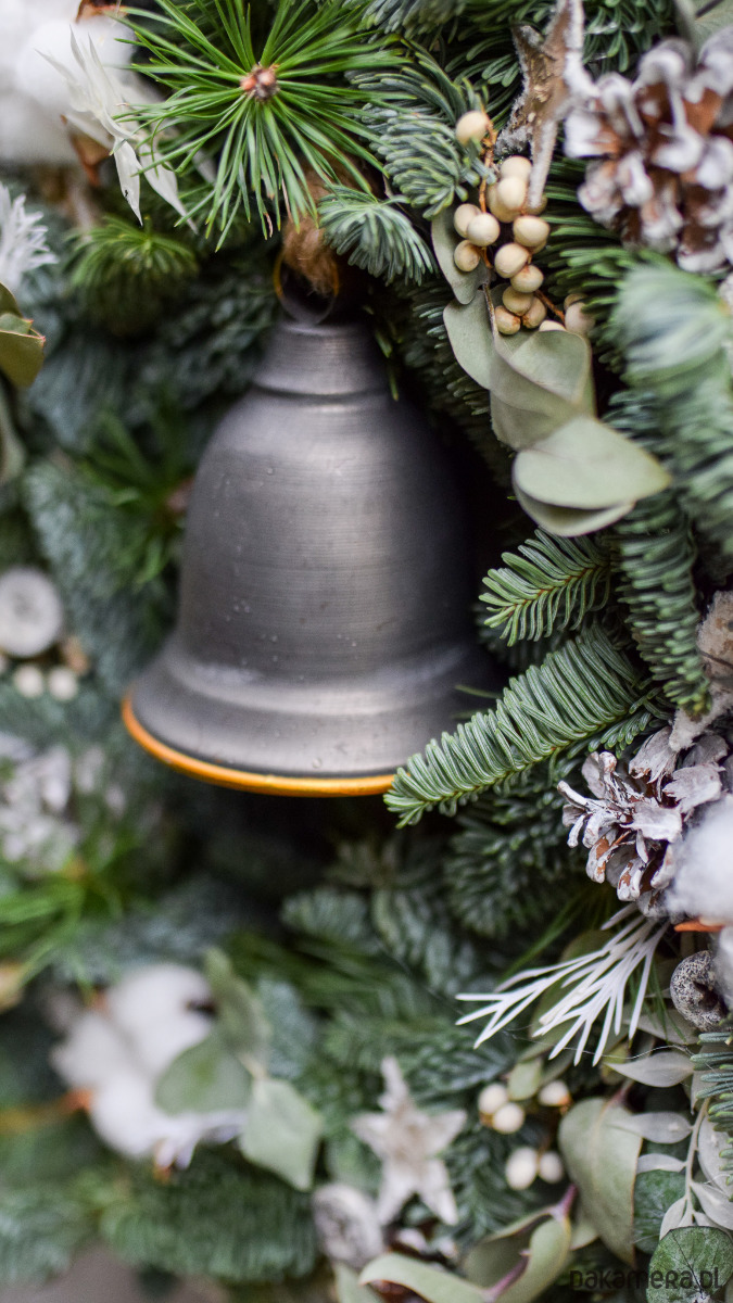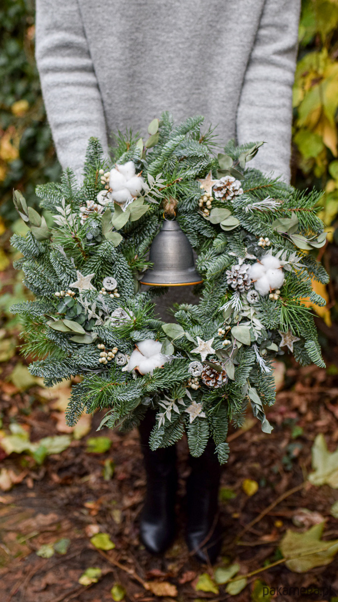 Wianek jest misternie udekorowany w odcieniach białego i szarości, co nie tylko nadaje mu elegancji i subtelności, ale także doskonale wpisuje się w estetykę skandynawskiego designu. Dodatkowy element tego magicznego wianka to duży dzwonek, który wisząc, delikatnie wybija dźwięki, jakby opowiadał historię zimowego krajobrazu.
