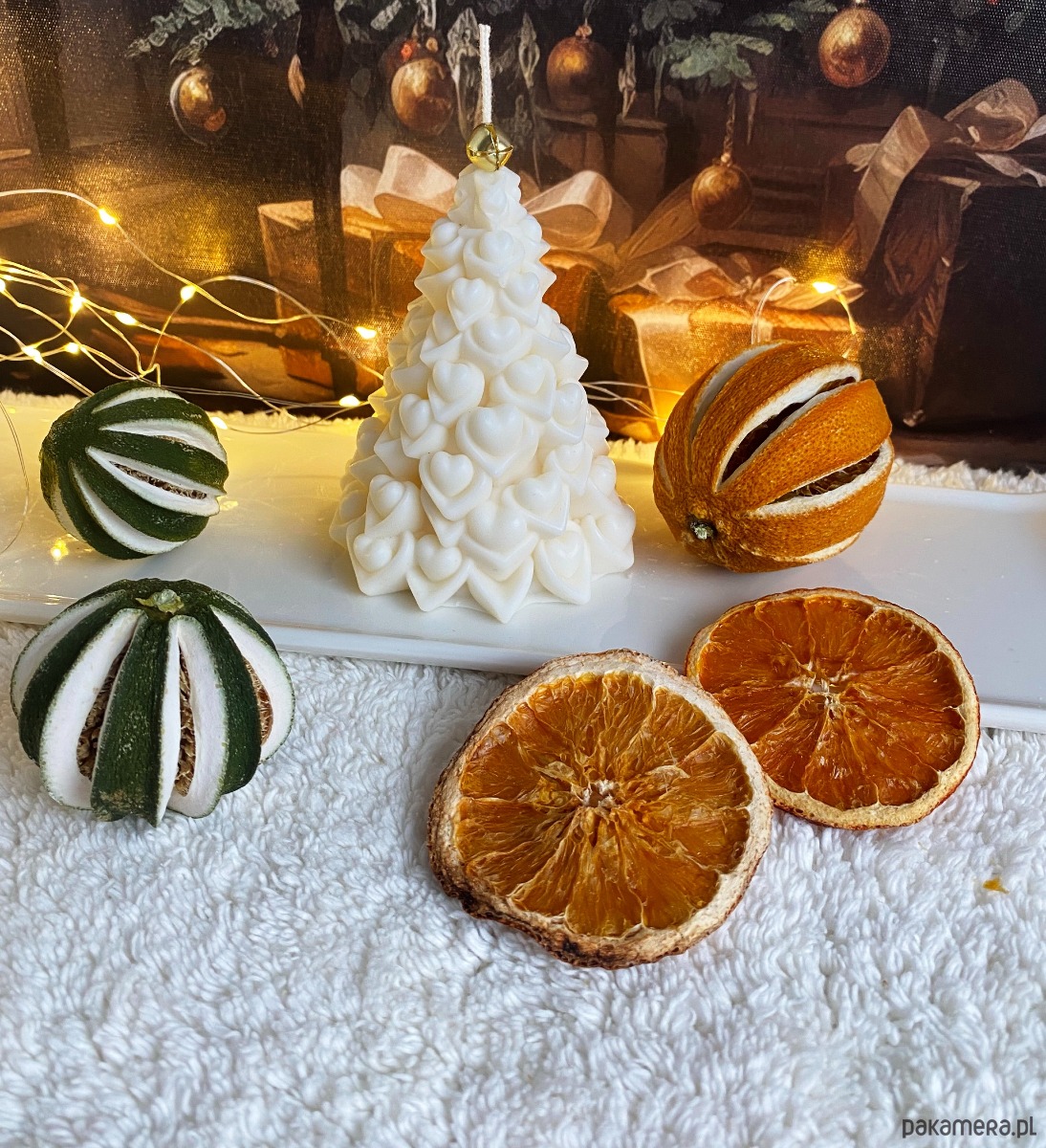 Wprowadź do swojego domu wyjątkowy, świąteczny nastrój dzięki naszej świecy w kształcie choinki ozdobionej sercami.